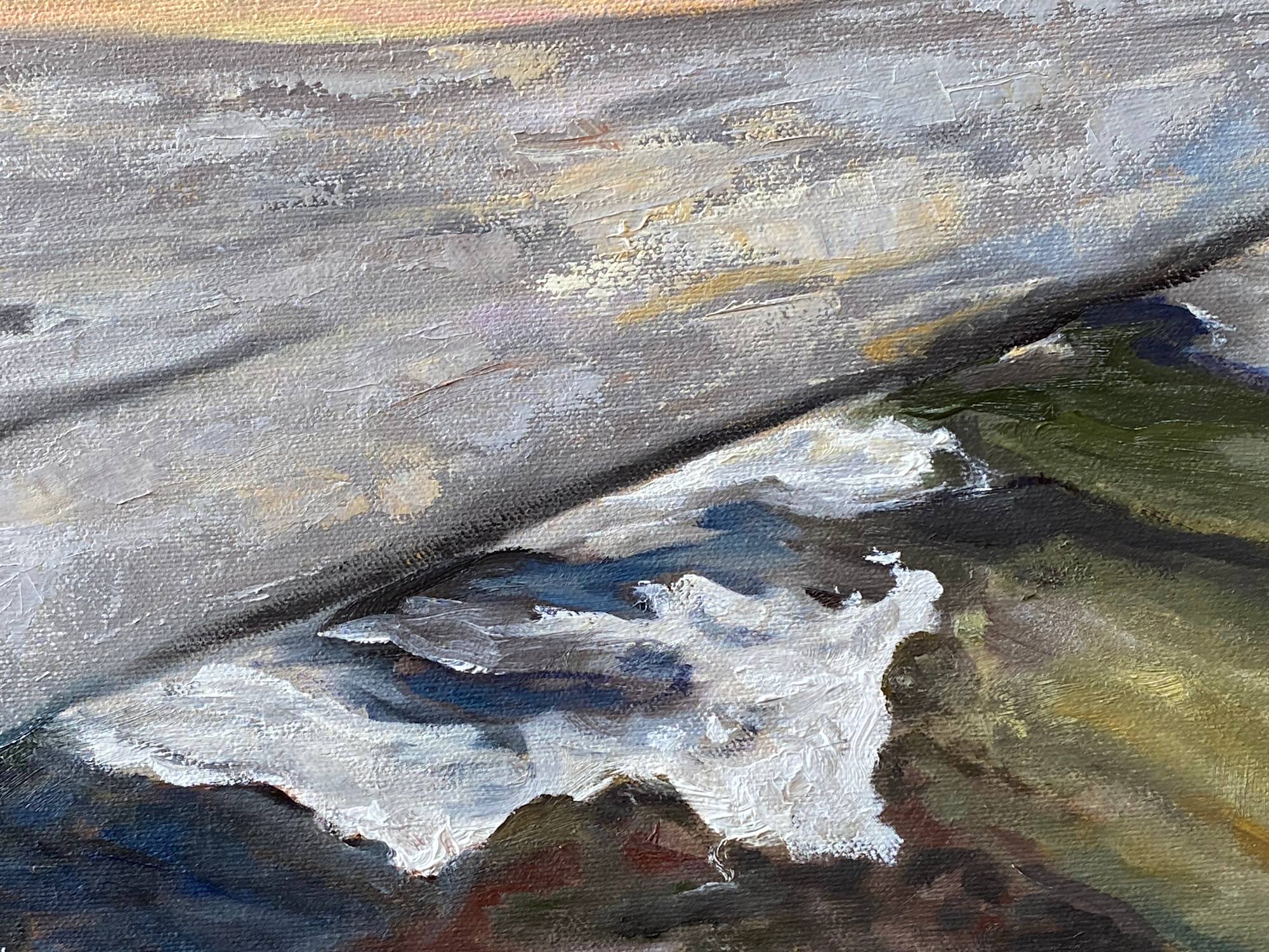 This painting beautifully evokes a sense of calmness and natural beauty, inviting viewers to lose themselves in its tranquil setting. The added backstory of the driftwood log during a time when many sought solace in nature's quiet corners, adds an emotional layer to the artwork. This piece is both a visual and emotional testament to the simple, profound moments of peace found along the coast.