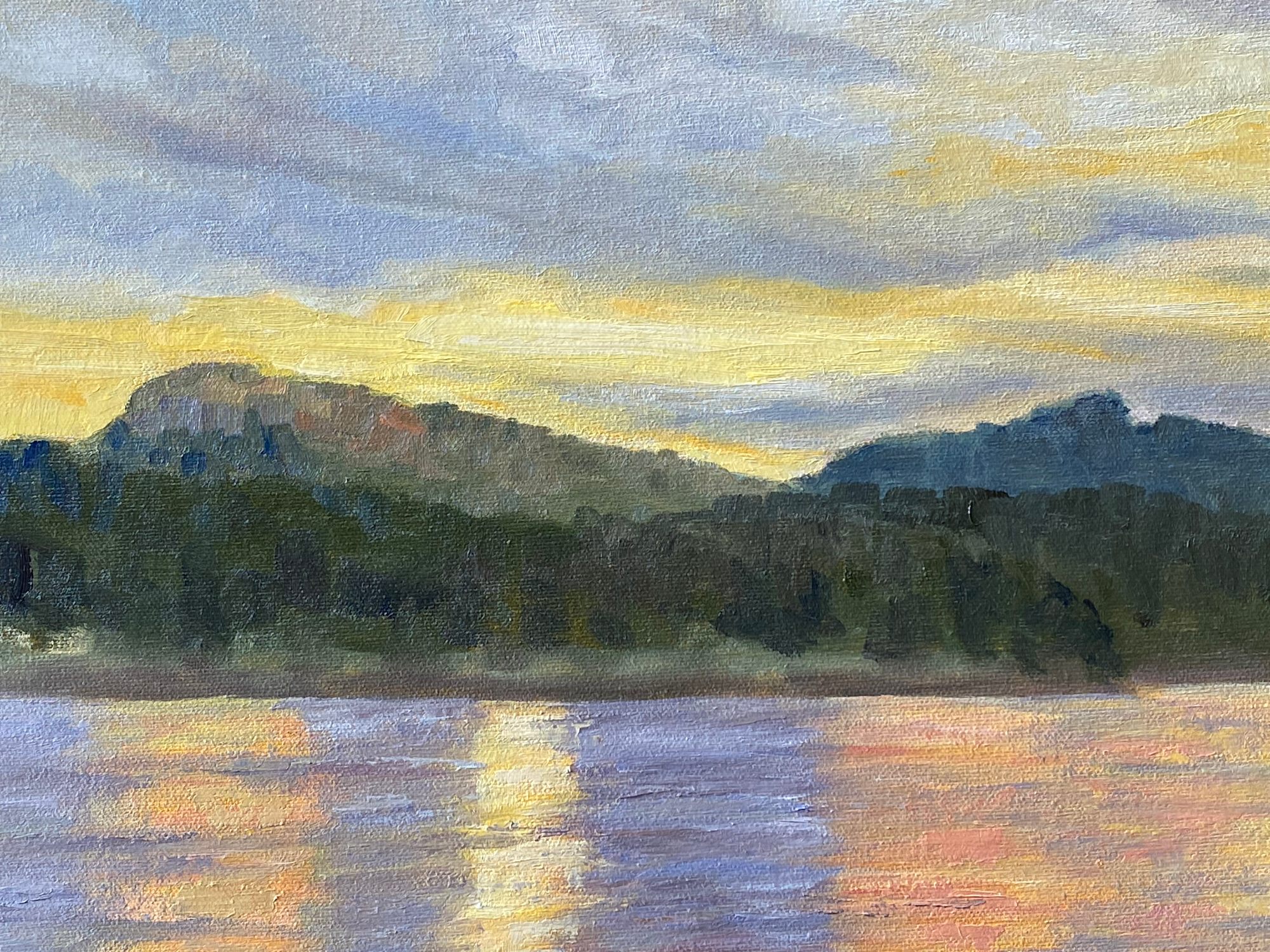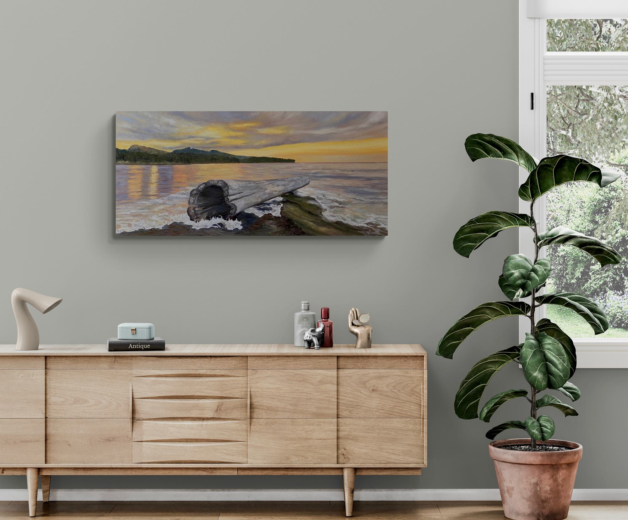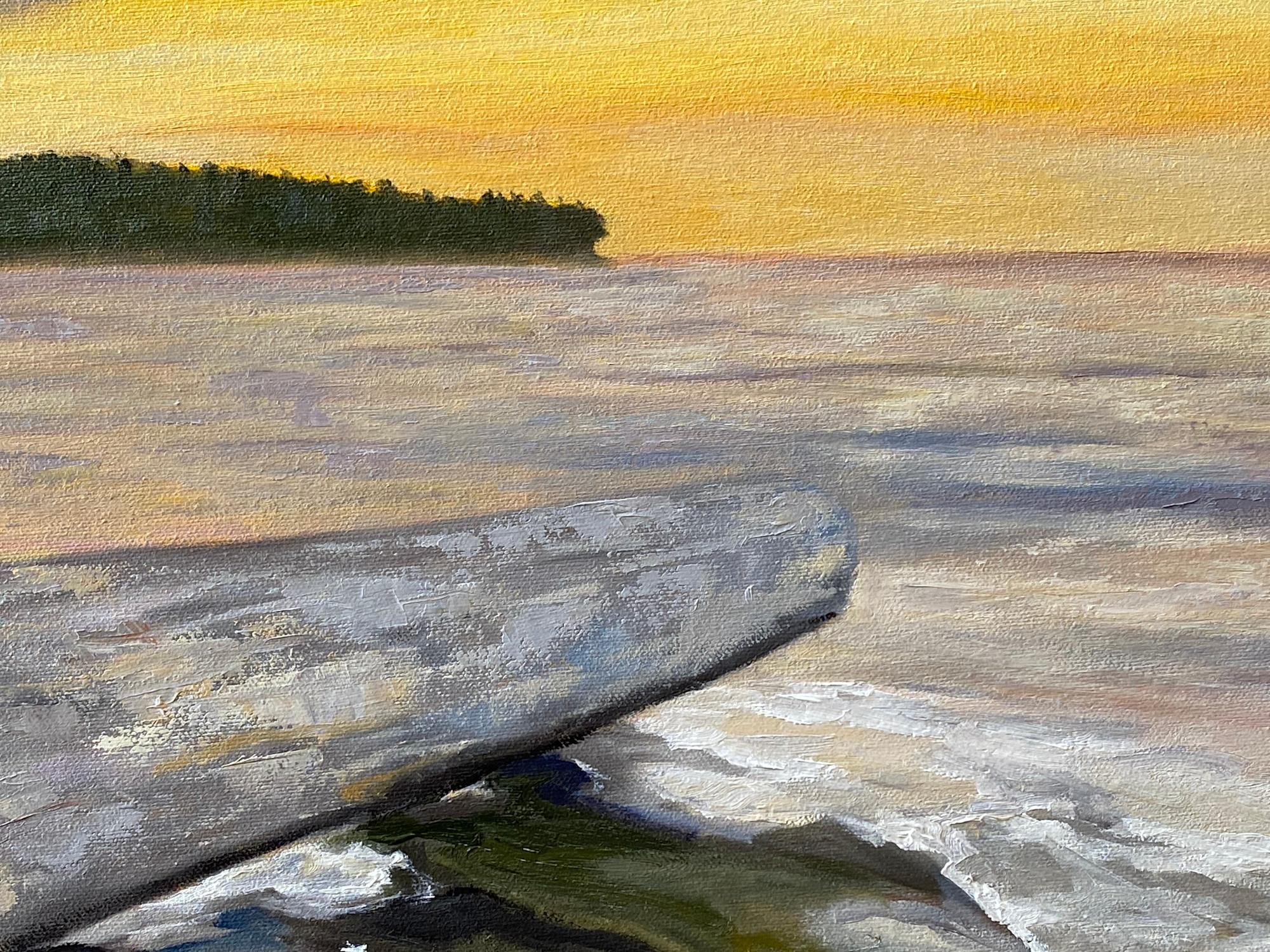 Artist notes: Various hues of mauve, yellow and burnt orange catch the sky while the Salish sea rocks a stranded drift wood log against the sandstone shore at the entrance to Active Pass. It was during the first year of the Covid pandemic and people were often out alone or in small groups walking the shores. The log became a symbol of endurance and solace, until a salvager came and rescued it to sell to a furniture maker.