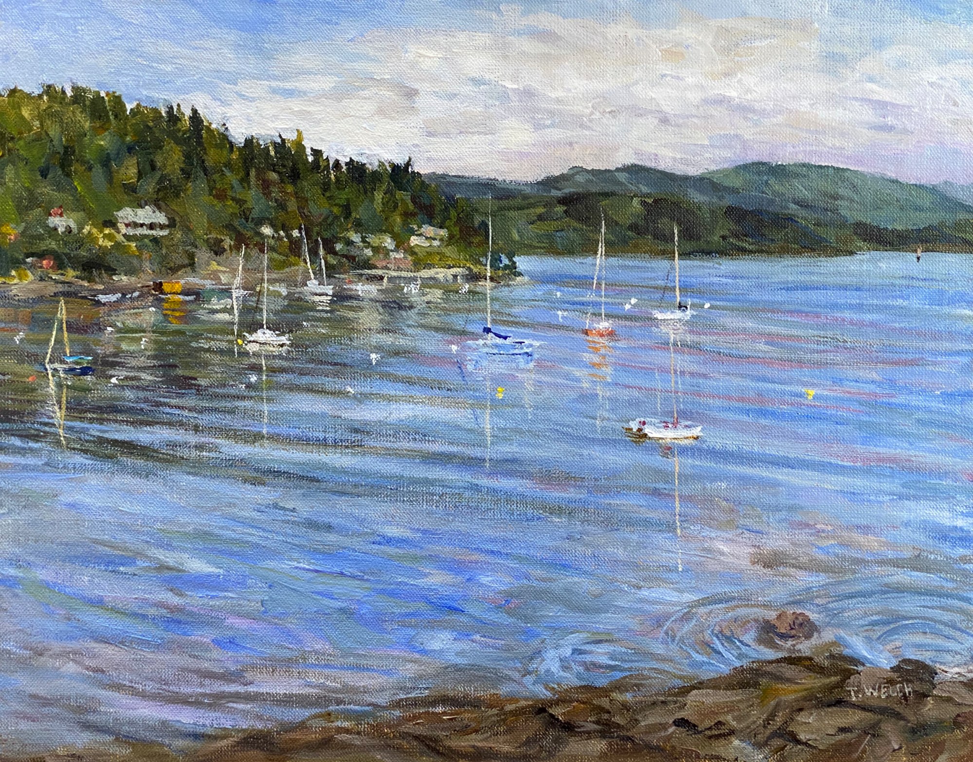 Taking my morning coffee with me, I arrived by request at the shore of private property in Village Bay. It was just before 7:00 am and gorgeous light. I set up and started to work when the neighbour came down to take my photo also by request. This painting is a surprise birthday present of a much loved view. The steps to its creation are being documented. After a significant amount of time, with the light changing even too fast for me, I packed up and finished the painting in my home studio using references of my favourite light during the morning’s adventure.