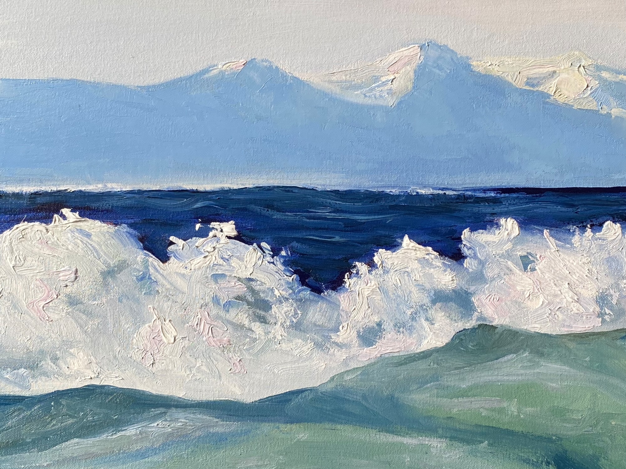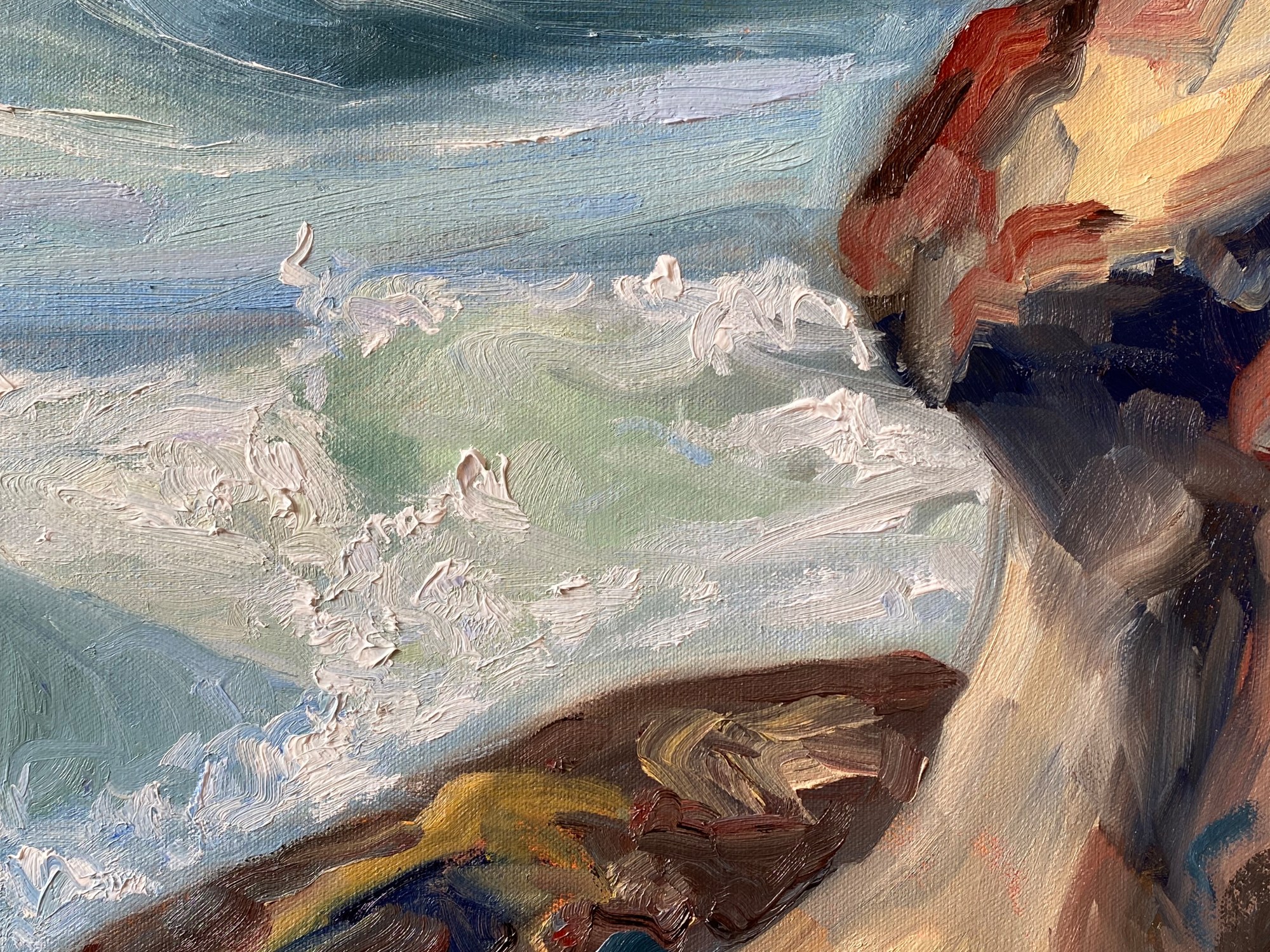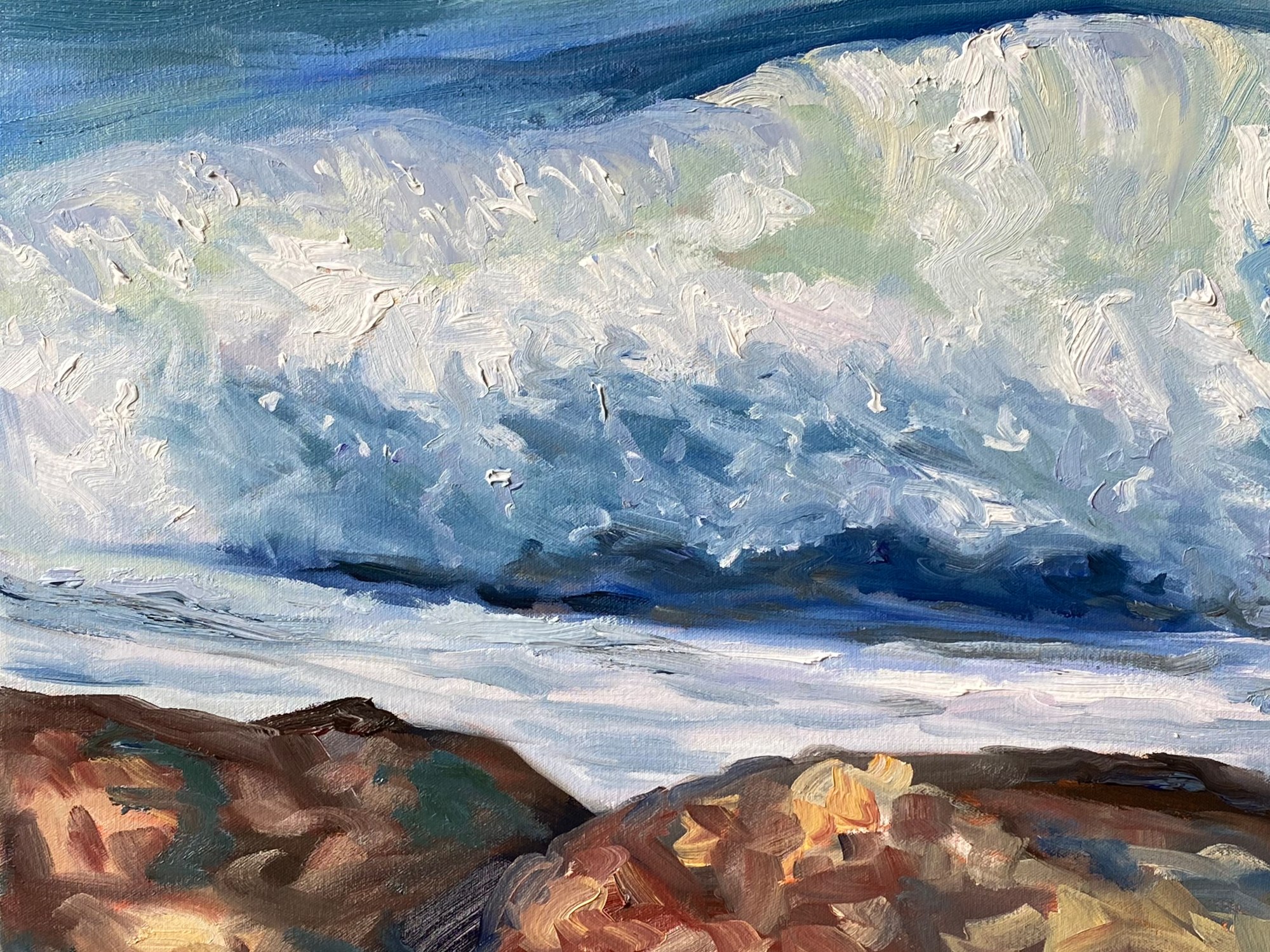 Artist notes: There are only a few days in a year when the sea is midnight blue and sun catches the ocean spray. They tend to be after heavy rains and high winds during the winter when the sun hangs low and makes but a brief appearance. During these times the sea and air snaps with energy and I am fully prepared to get wet to capture my references and clean the saltwater off of my lens when I get home. Then I will revisit these moments several times with a canvas on the easel, liked in this painting.