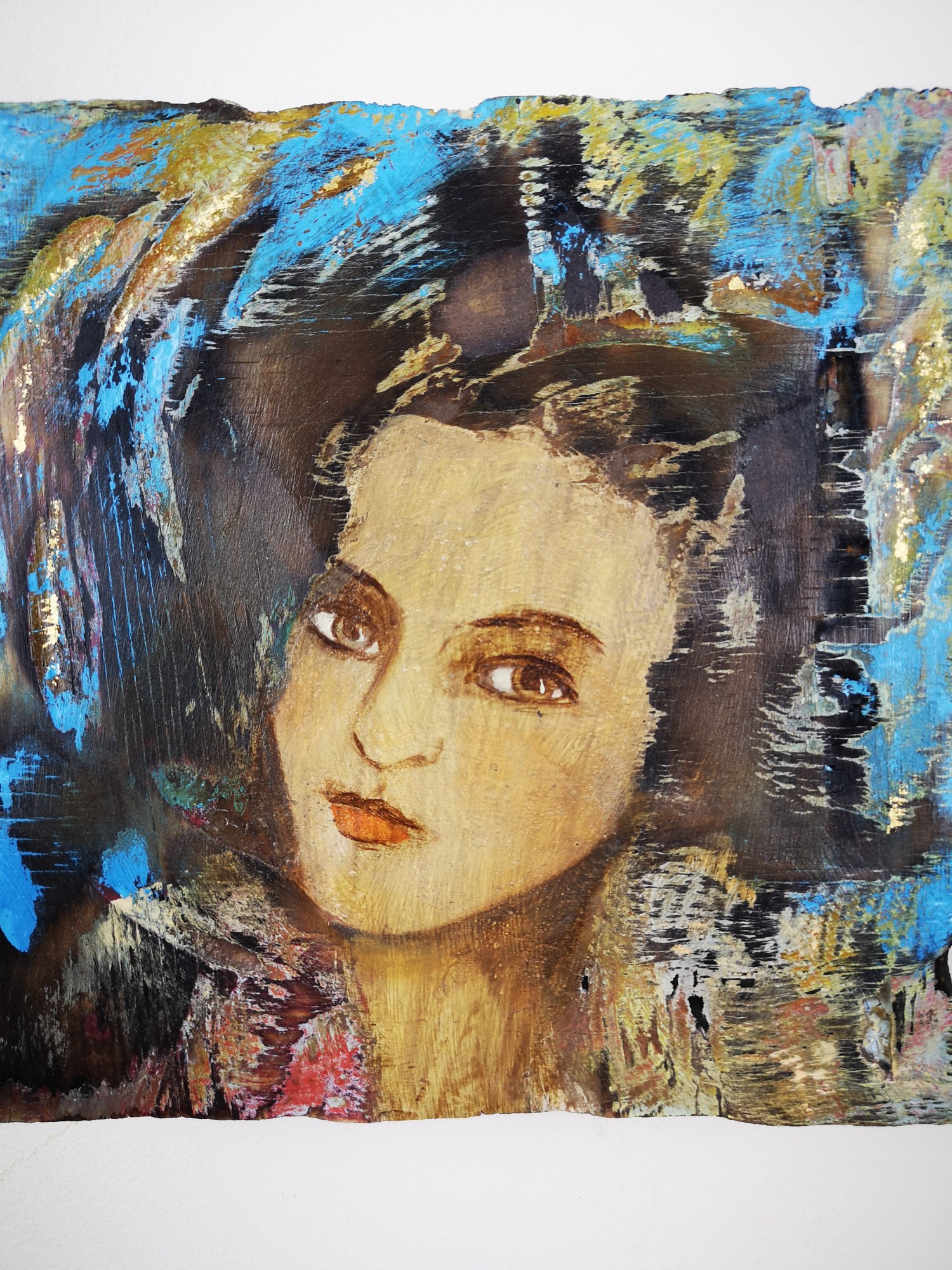 The background is made by Markus, by carving, painting, scorching and sanding. He then prepares and primes a space for Tessa to paint the face in oils.