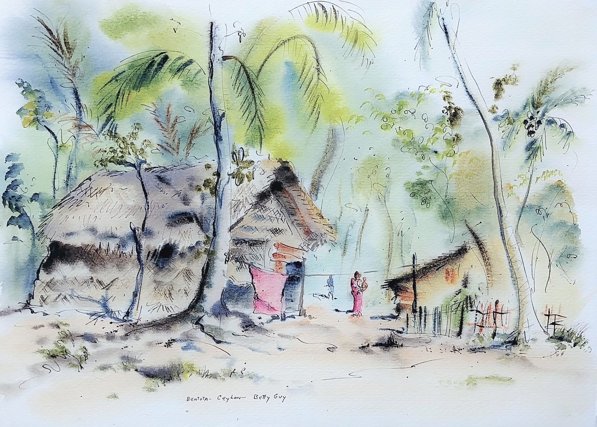 In Sri Lanka, a woman in red with a baby, two straw houses and trees all around.