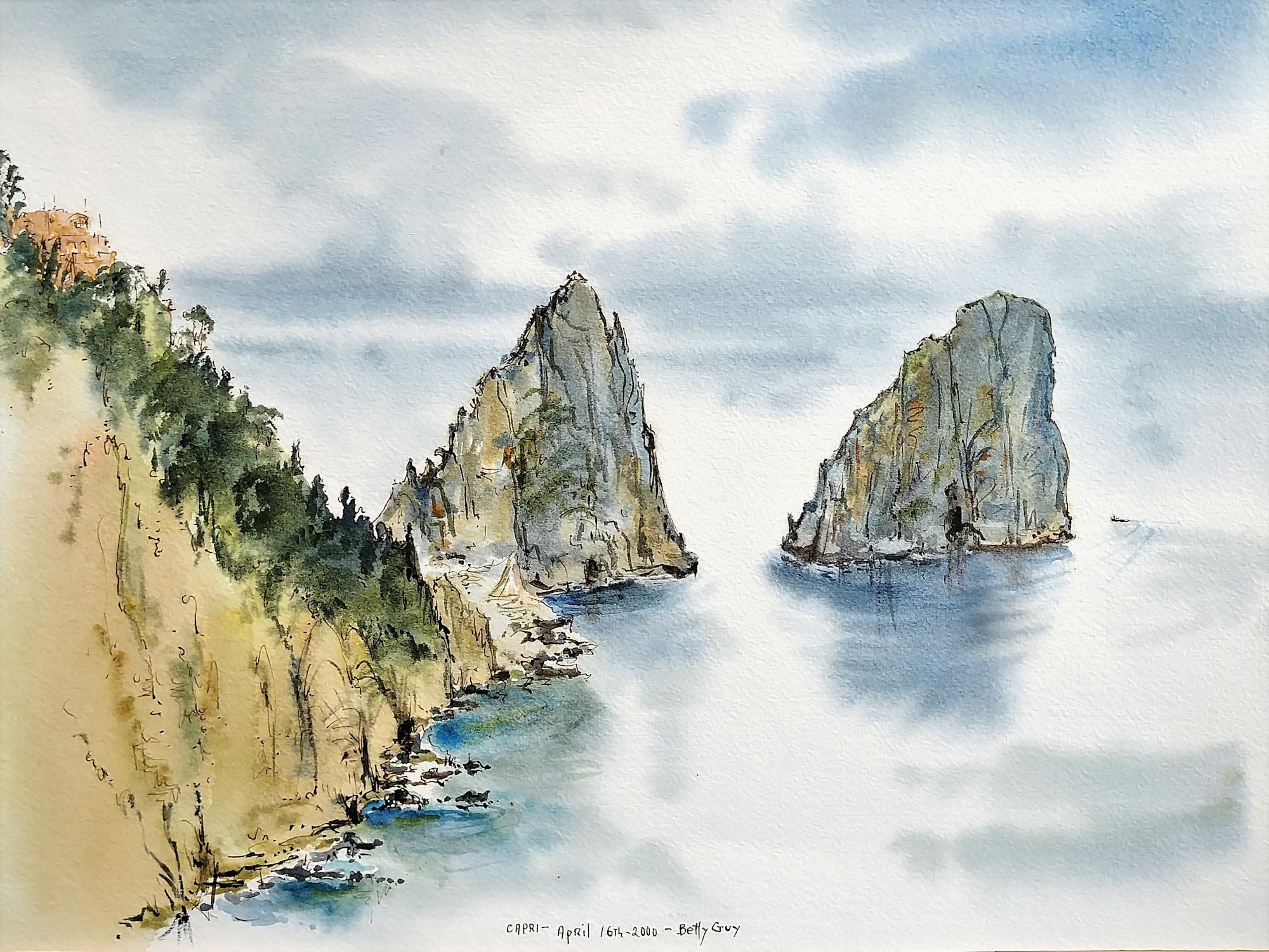 A view of the coast and two gigantic road formations, called stacks, in the water. Faraglioni.