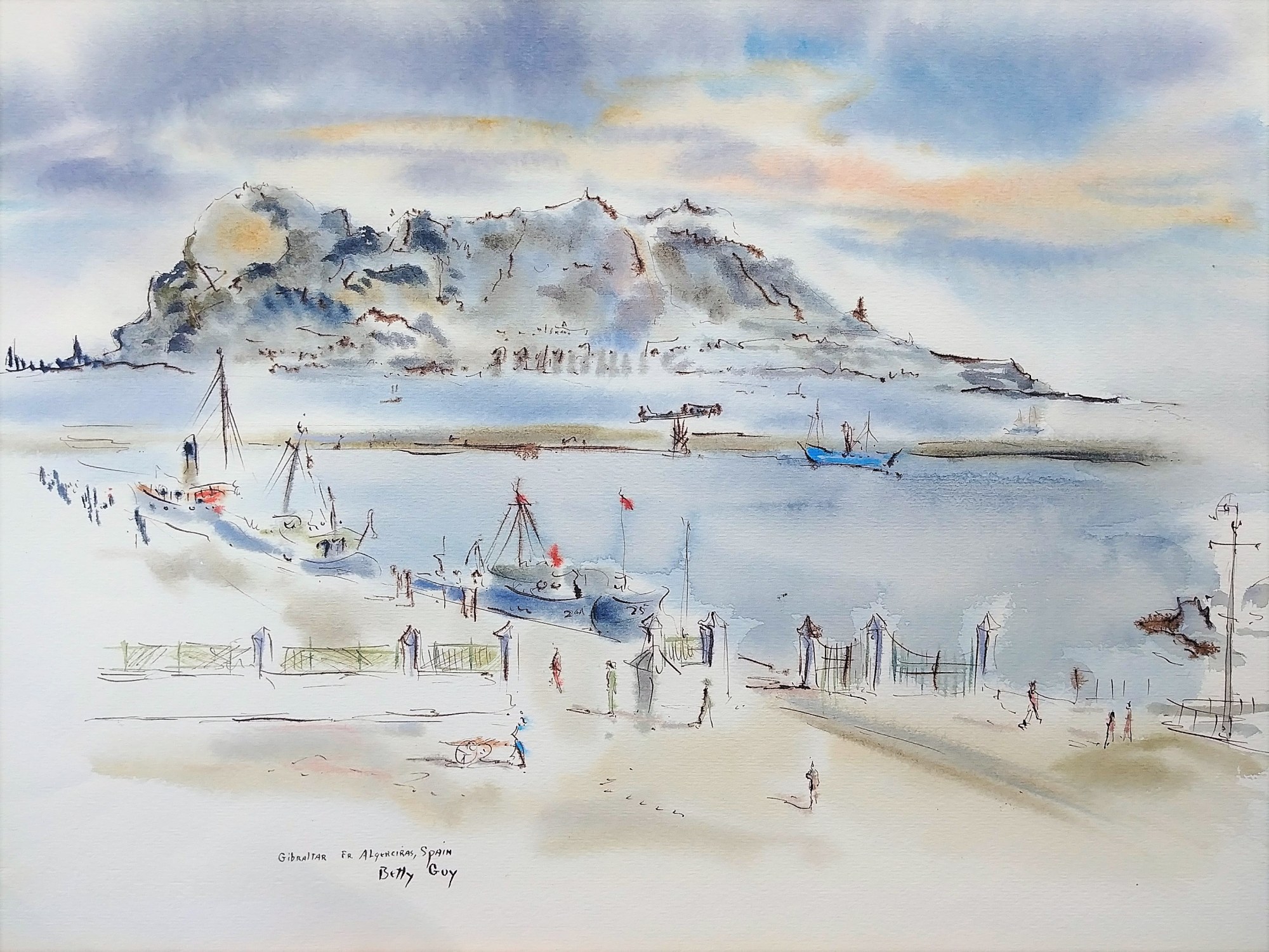 Gibraltar rock in the background, boats and people walking in the foreground.
