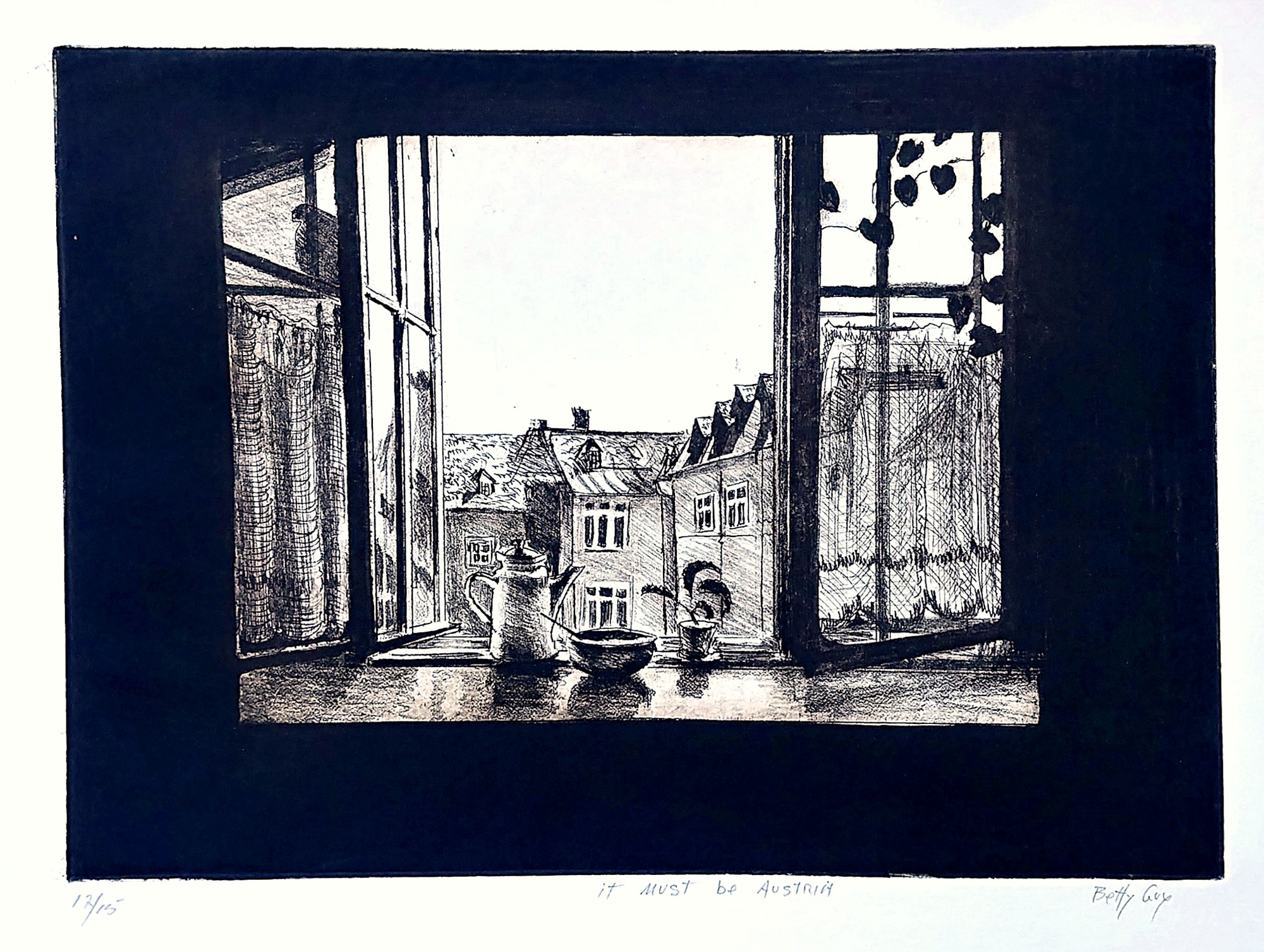 An open window with a tea pot and bowl in the foreground, buildings in the background.