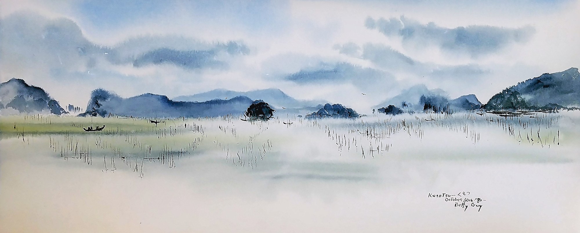 Grassy water in the foreground, little boats in the water, mountains in the background.