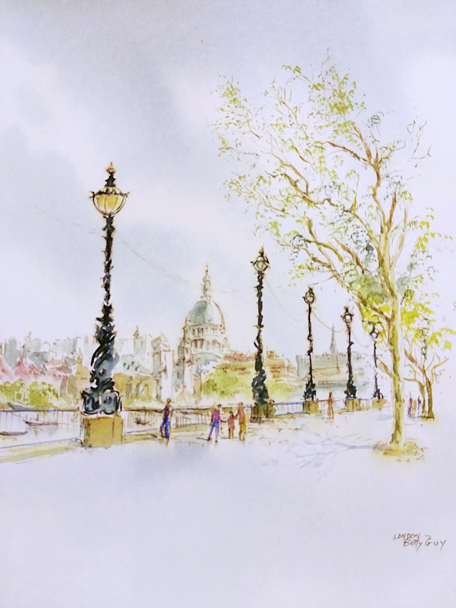 Walkway along the water. Boats in the water. A tall tower on domed roof top and other buildings in the background.