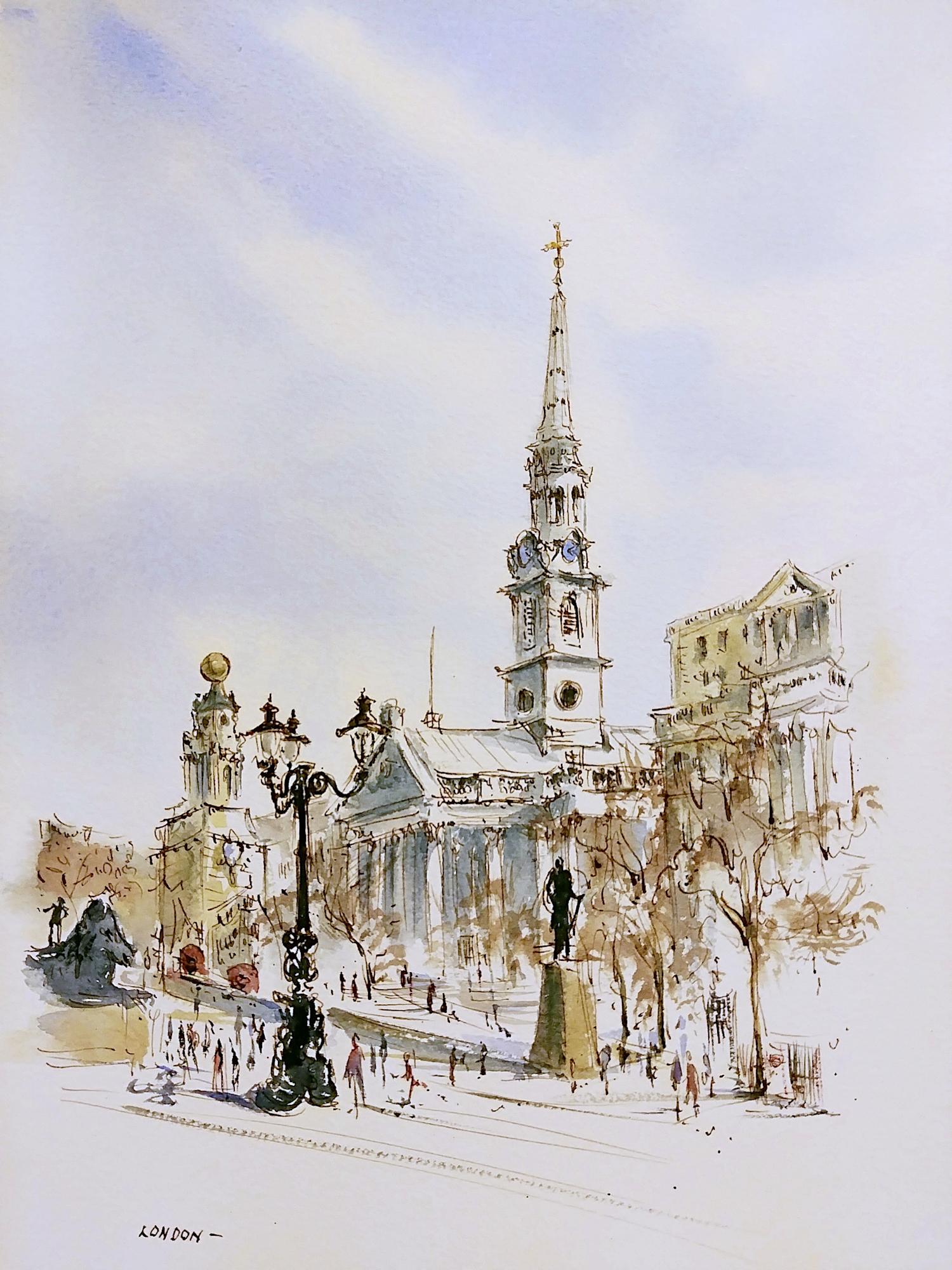 Building with a tall steeple, statues in the front of the building, people walking around.