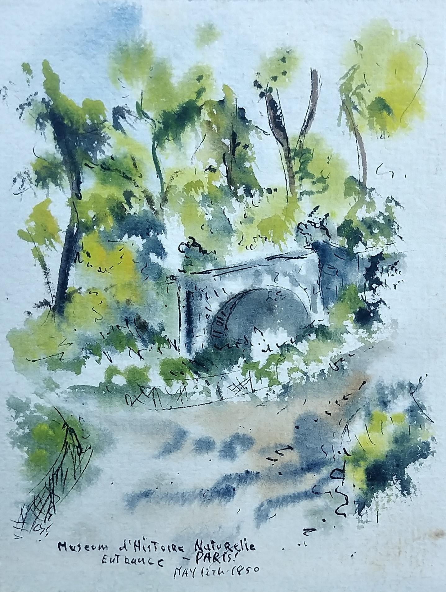 A stone building with an arched doorway. Trees and a path are around the structure.