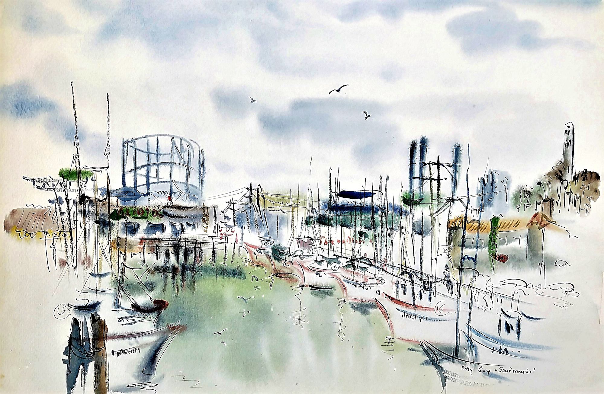 Coit Tower to the right, a marina with docked boats in the foreground.