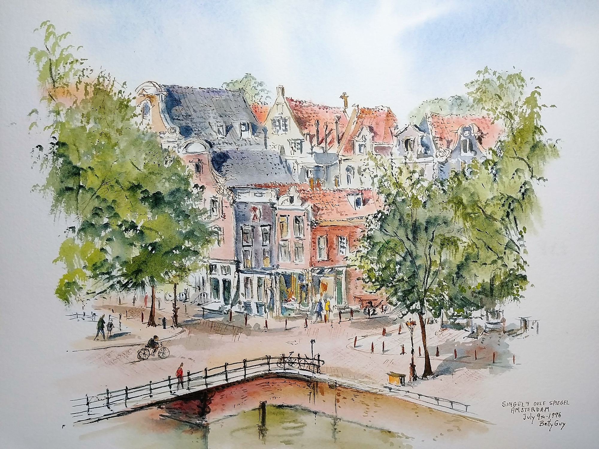 A bustling street corner with people walking and riding bikes. A canal or river is in the foreground.