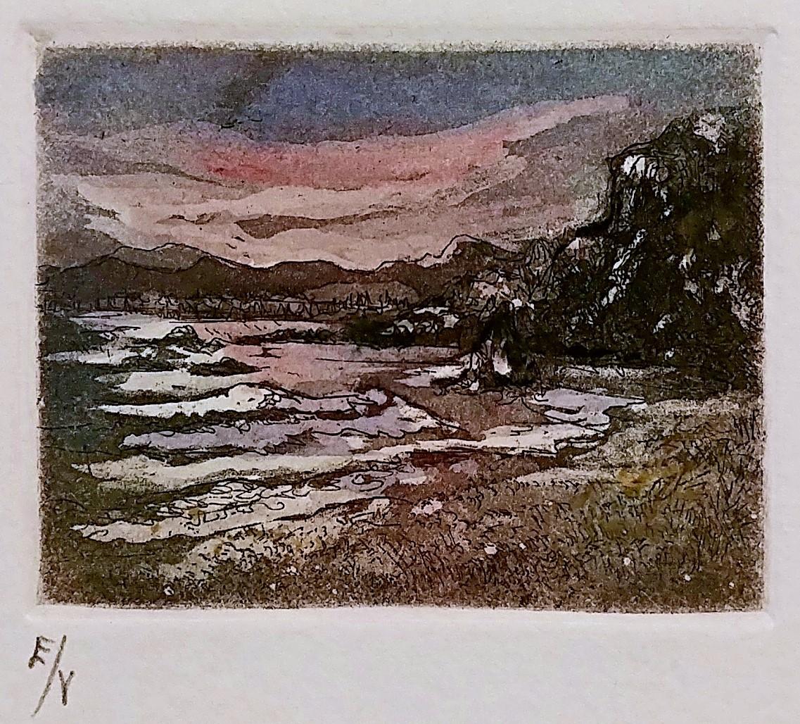 Pink, purple, gray colors of the ocean, shore and cliffs.