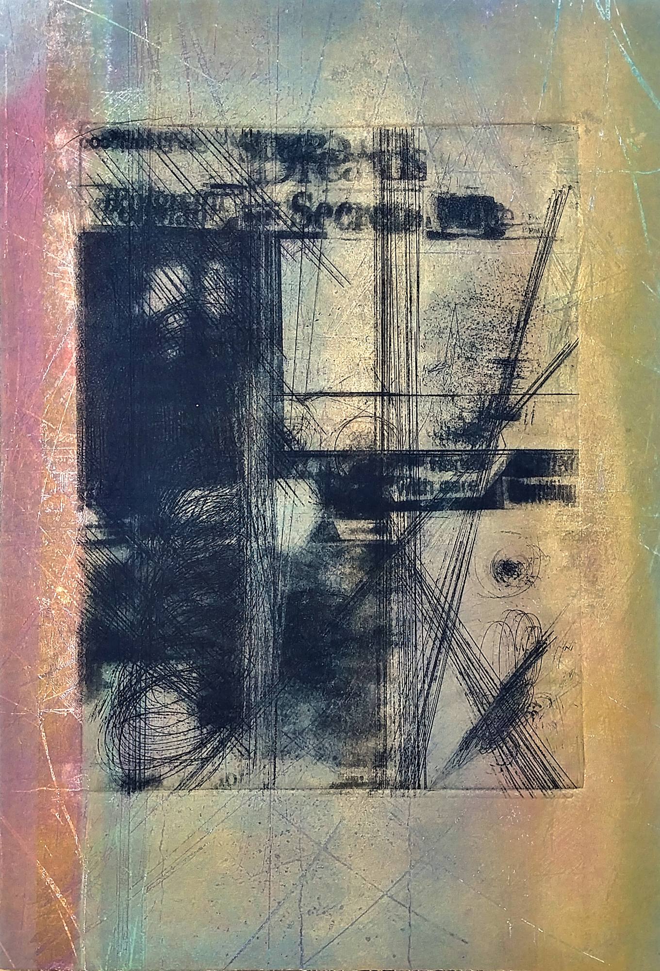 Abstract with mauve, black, green, purple, copper, gold and blue.