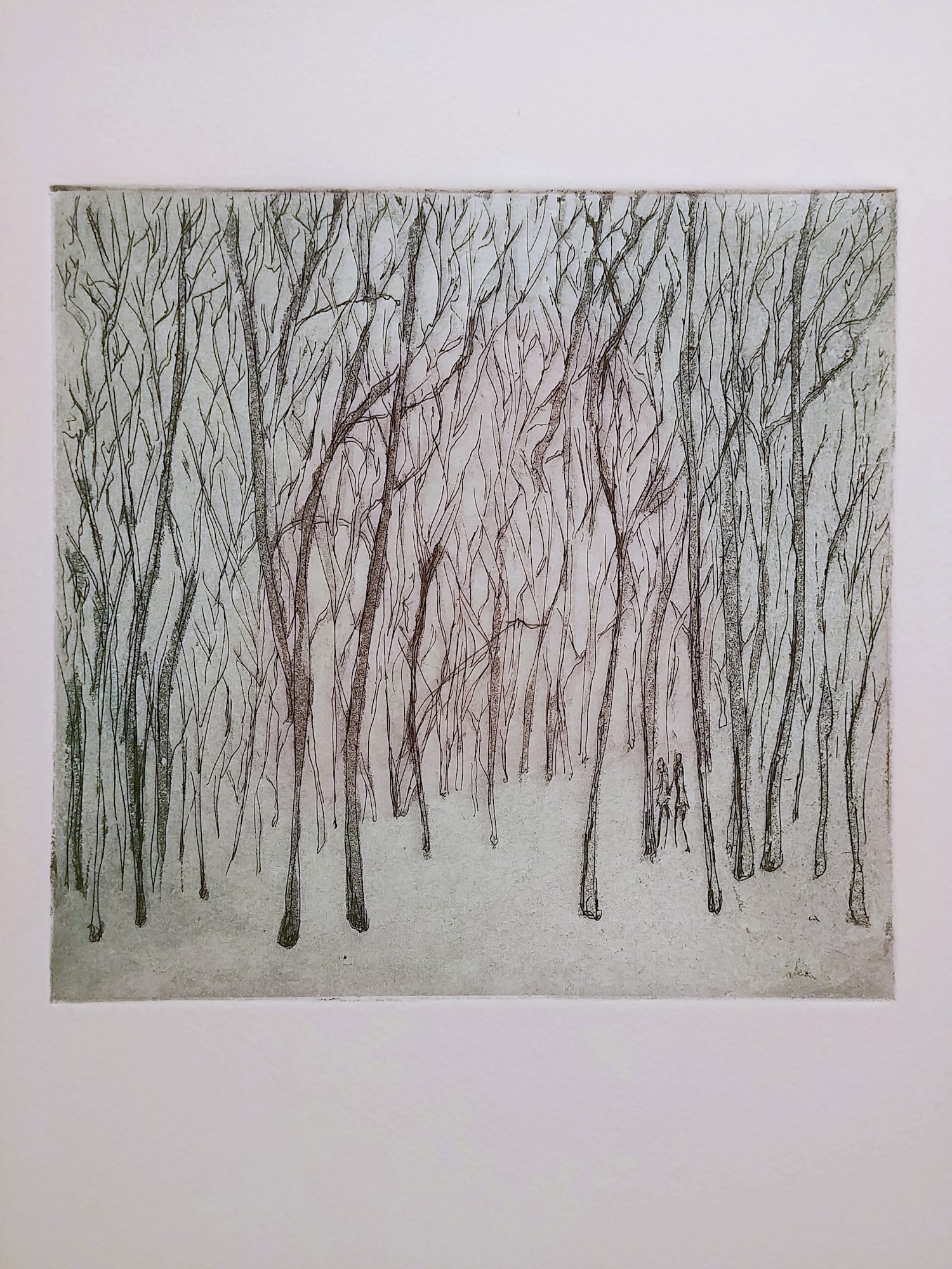 Bare branched trees and two people walking amongst them.