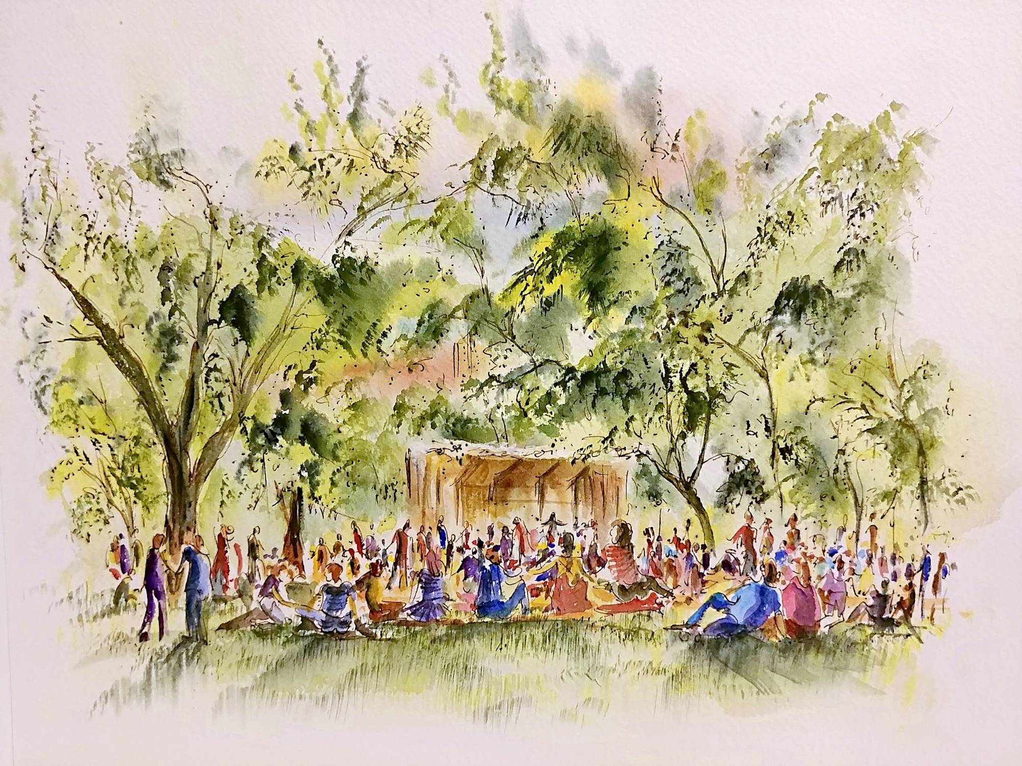 View of people sitting on the grass, in a park, with a brown structure in the background. In New York.