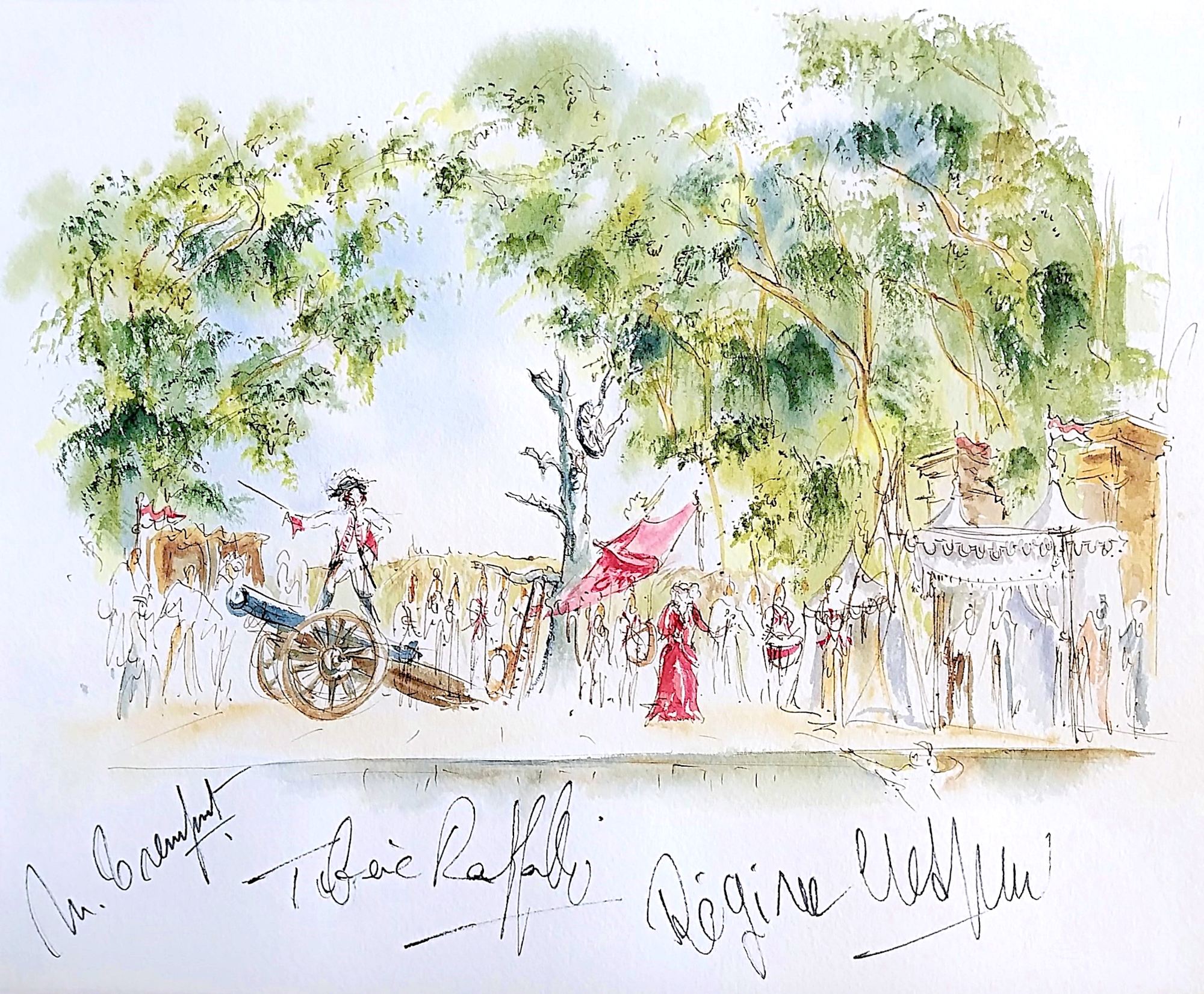 A scene with a man standing on a canon, a woman in red is near him. Autographed by three people.