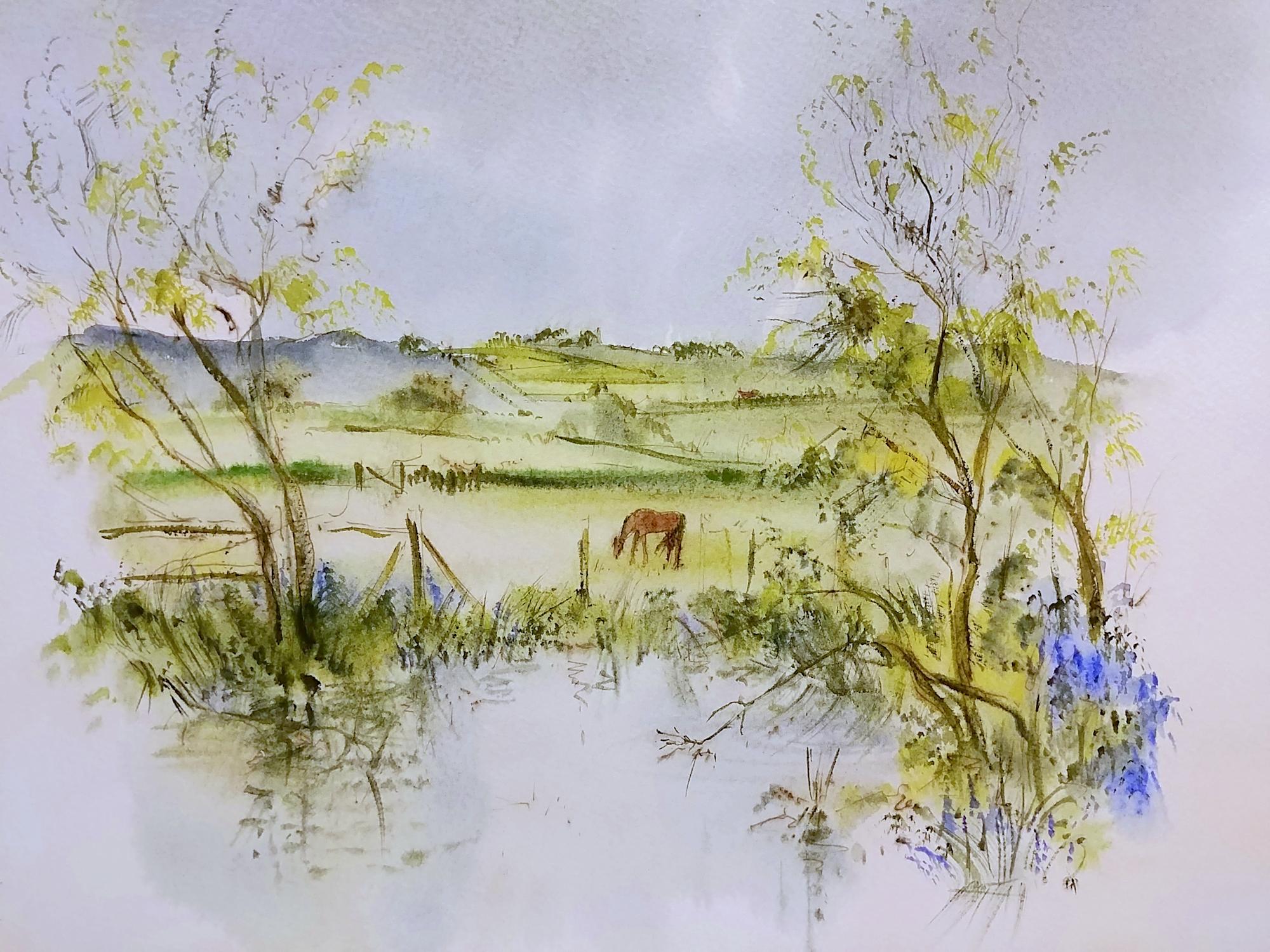 A brown horse is in the center, pond in the front with blue flowers on the side, and green hills in the background.