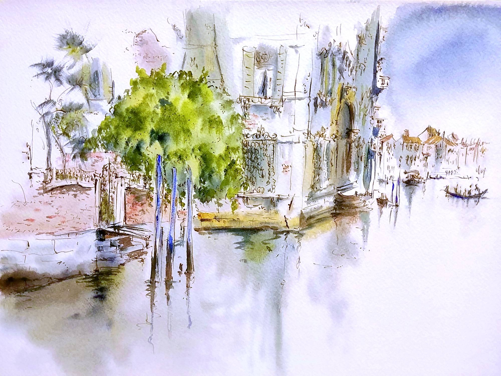In Venice. Gondolas on the water, a small pier to the left and other buildings in the background.