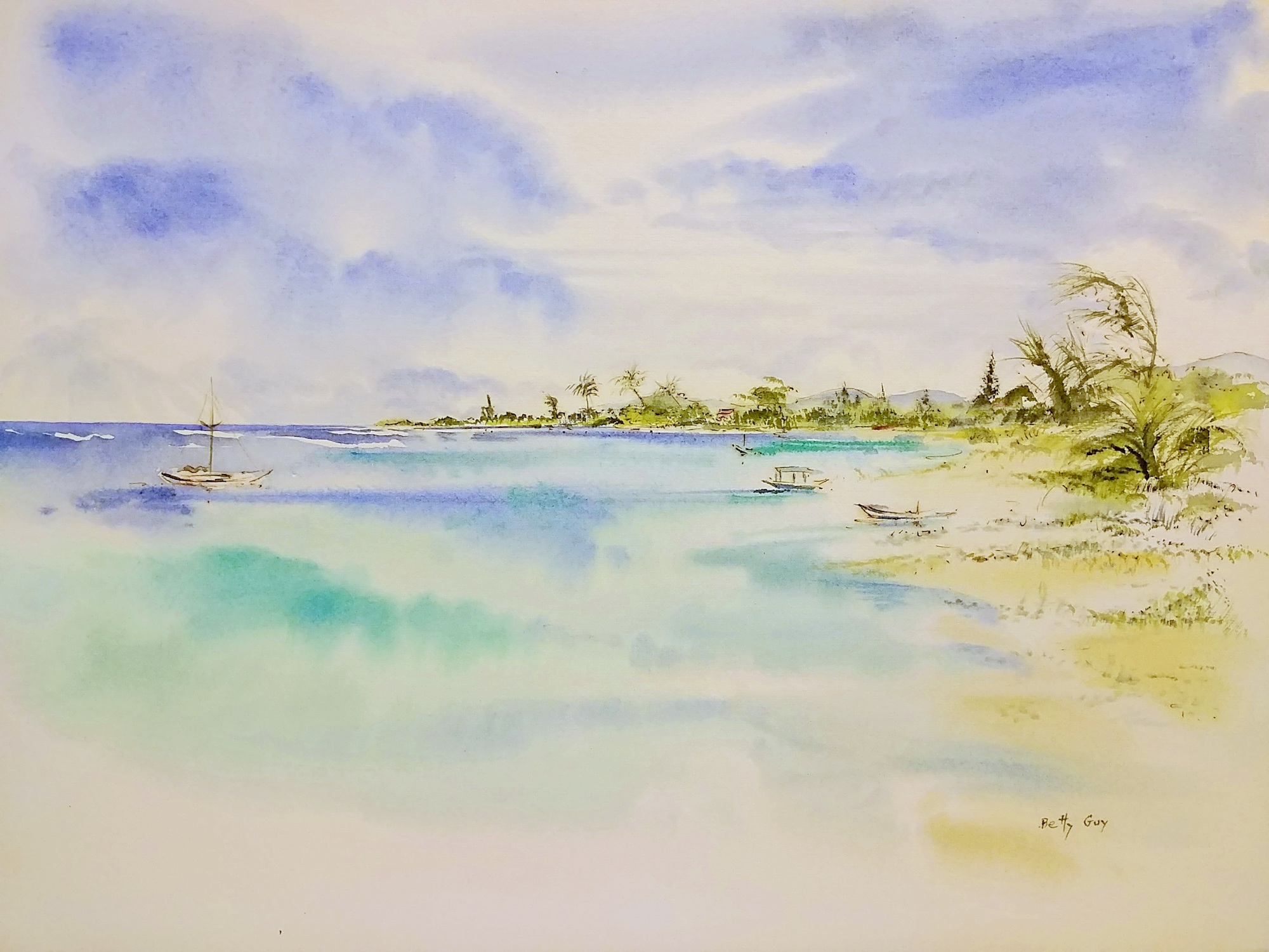 A view of a shoreline with a sailboat to the left, two other small boats on the right and little red roofed house in the background.