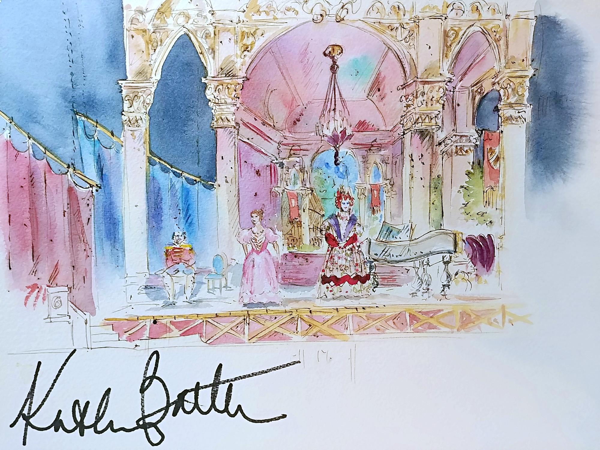 Two female characters and one male on stage. The set has a structure with columns and lots of pink, blue and gold tones. Autographed.