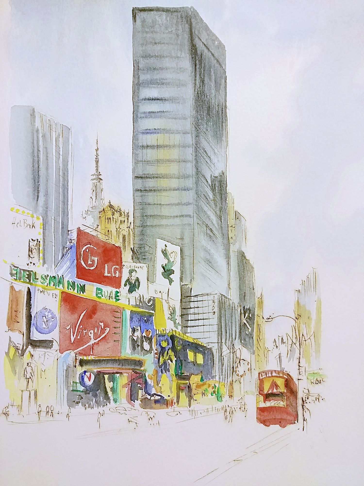 View of city street with red trolley, Virgin billboard. People on the street are drawn but not painted.