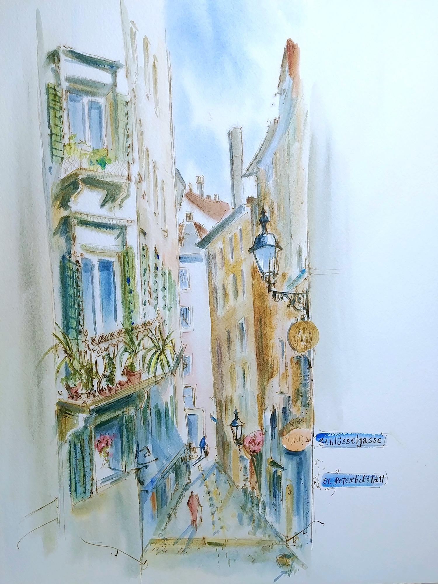 Narrow walkway between buildings, two blue signs on the right, Schlusselgasse & St. Peterhofstatt.