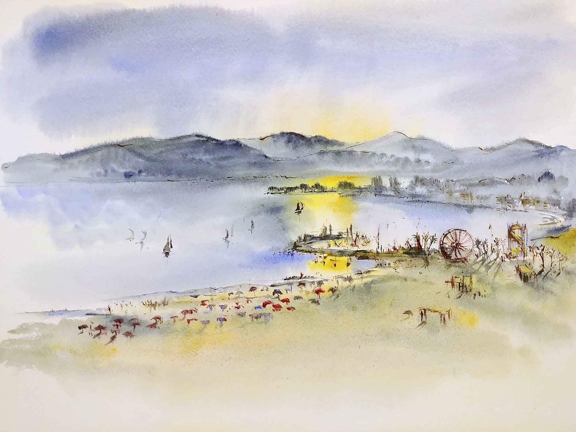 Sailboats near a shoreline in the foreground. A carnival is on the waterfront with a red ferris wheel. Mountains in the background.