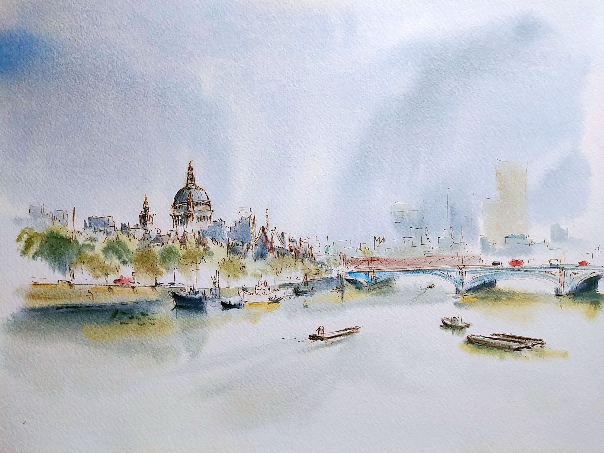 Bridge on the right hand side of the foreground, boats are in the water. There are red buses crossing the bridge. A domed building along with a cityscape is in the background.