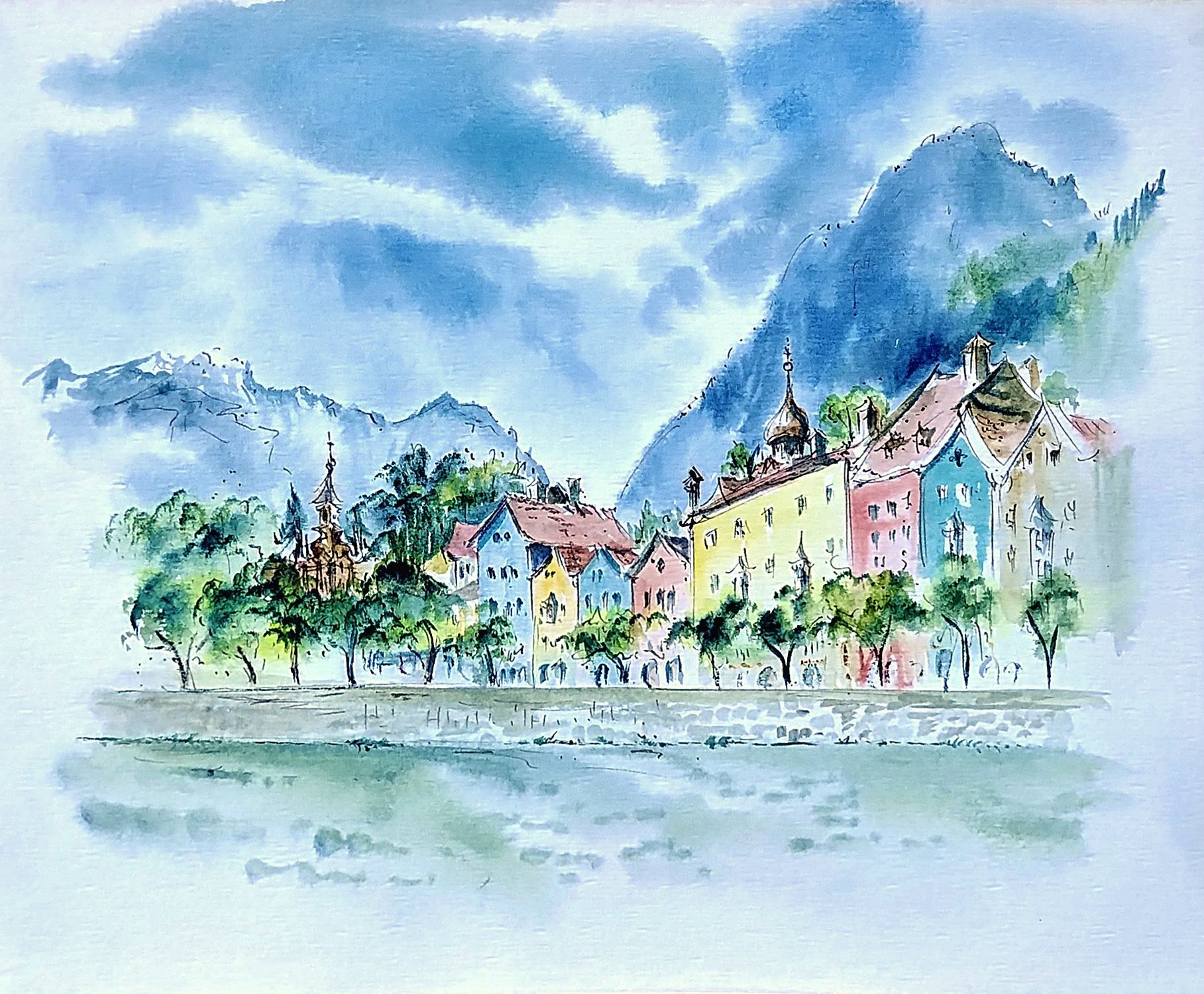 Water, stone wall, colorful buildings, mountains.