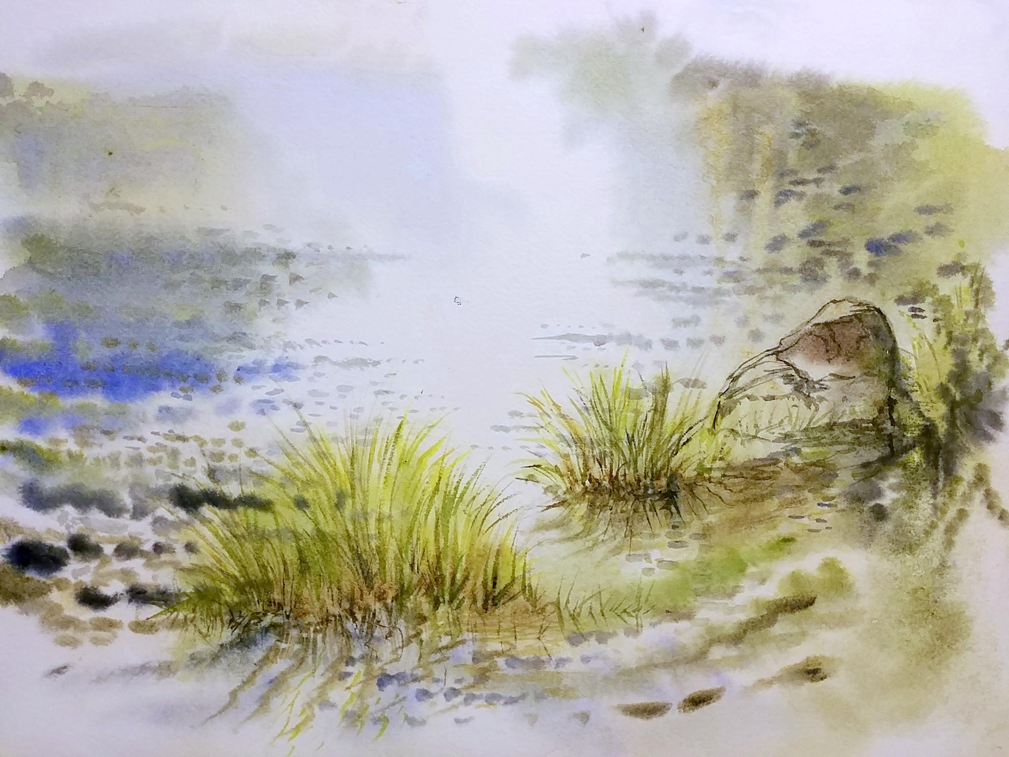 Double sided painting. One image is of a wooden walkway, green trees and touches of red.