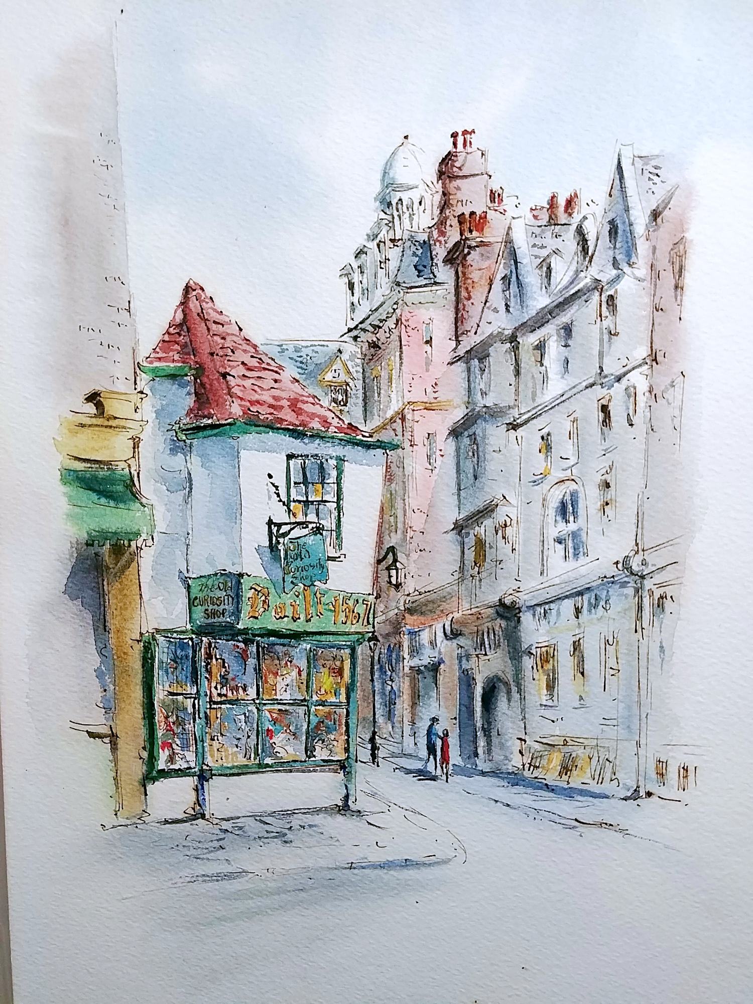 The Old Curiosity Shop is on the left. Two people are walking on the sidewalk, one person in red, the other in blue. Buildings line the street on the right.