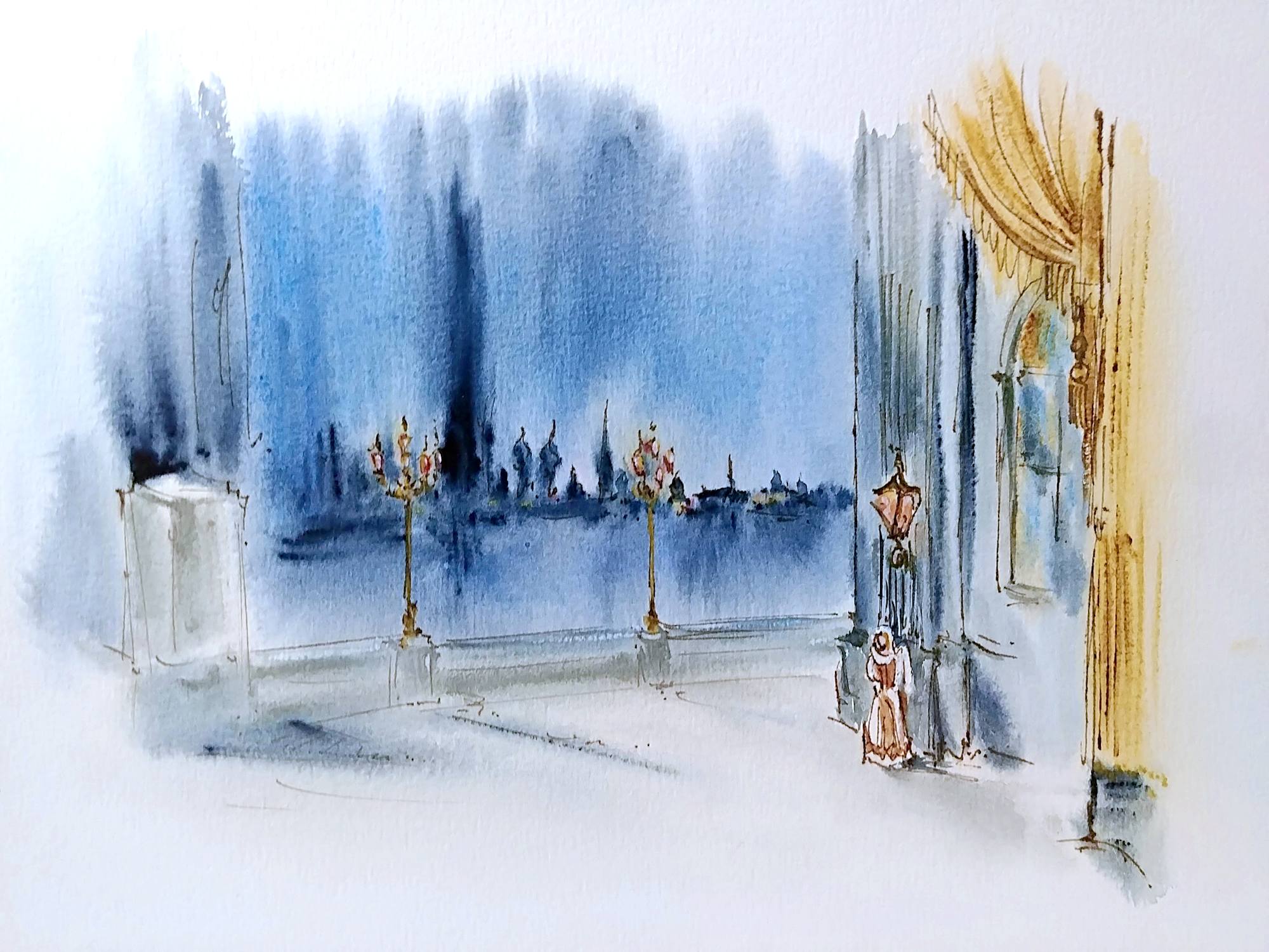A female character is standing beneath a lamp on the side of a building. A body of water is in the background.