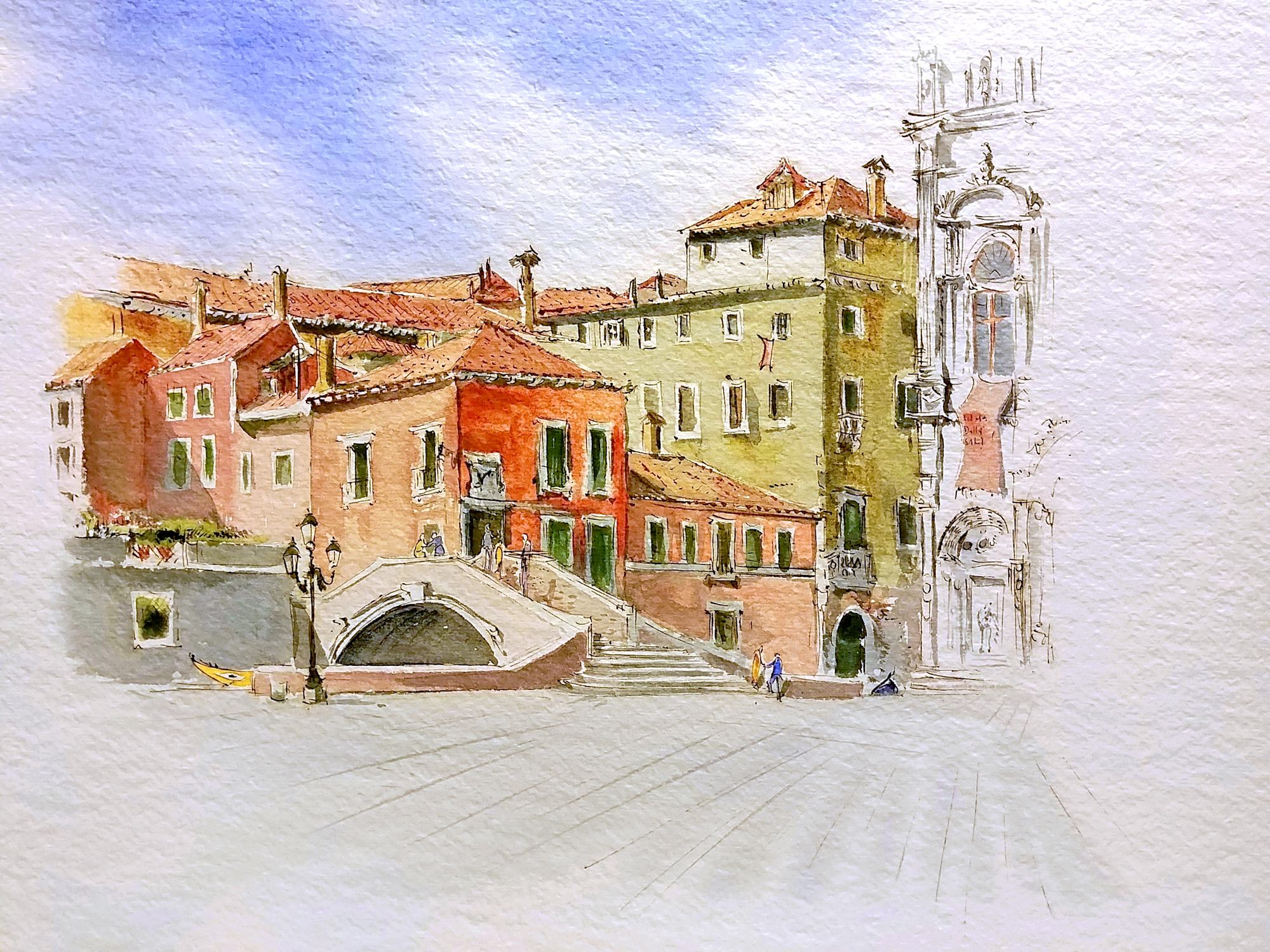 Blue, red, green and white buildings, yellow gondola in canal, people on stairs.