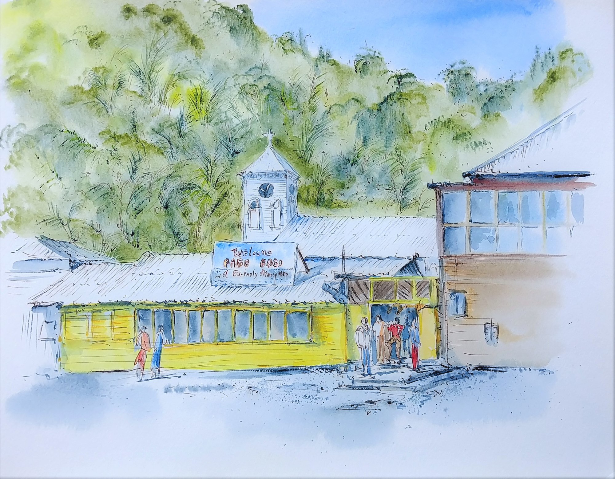 American Samoa. A yellow building, may be a church, with people outside. A sign on the building reads "Tuelcone Pago Pago A Friendly Atmosphere"