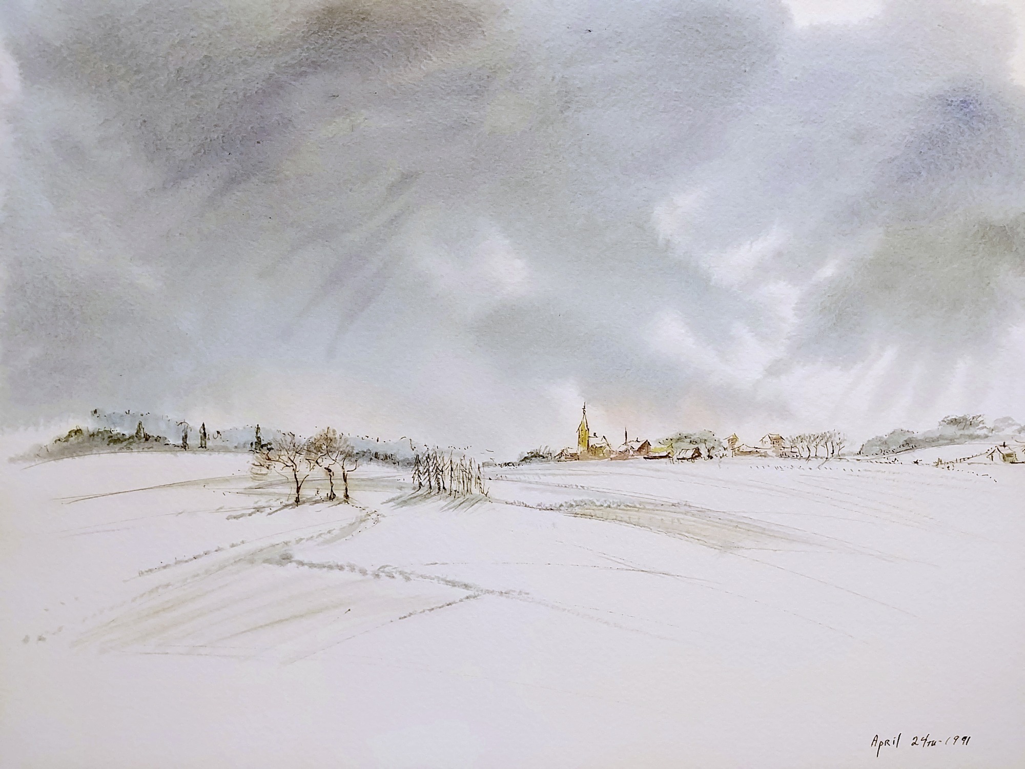 Snow covered fields with trees staggered about. There is a building in the background to the right, it may be a church.