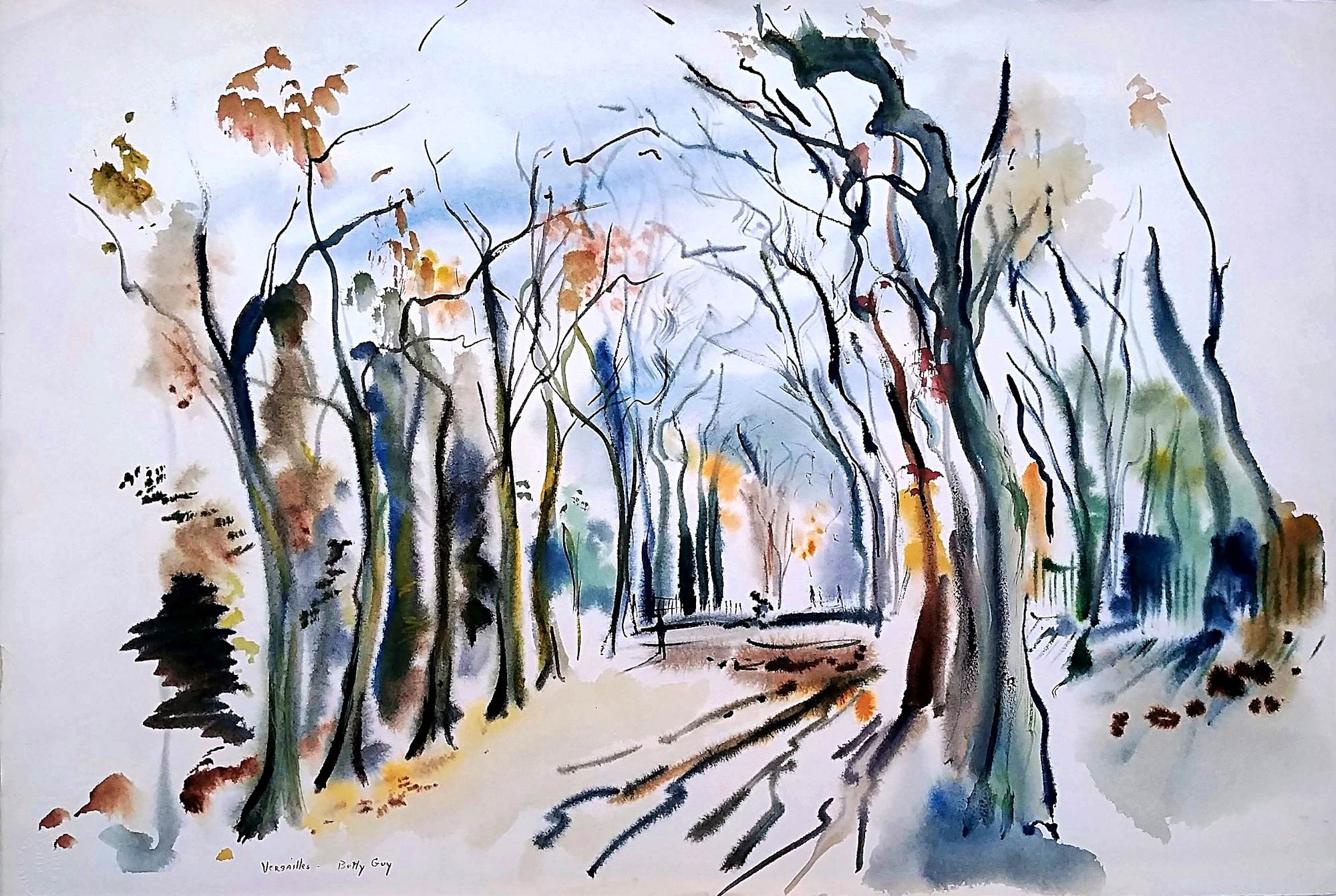 Trees with bare branches, small clusters of colorful leaves. People in the distance.