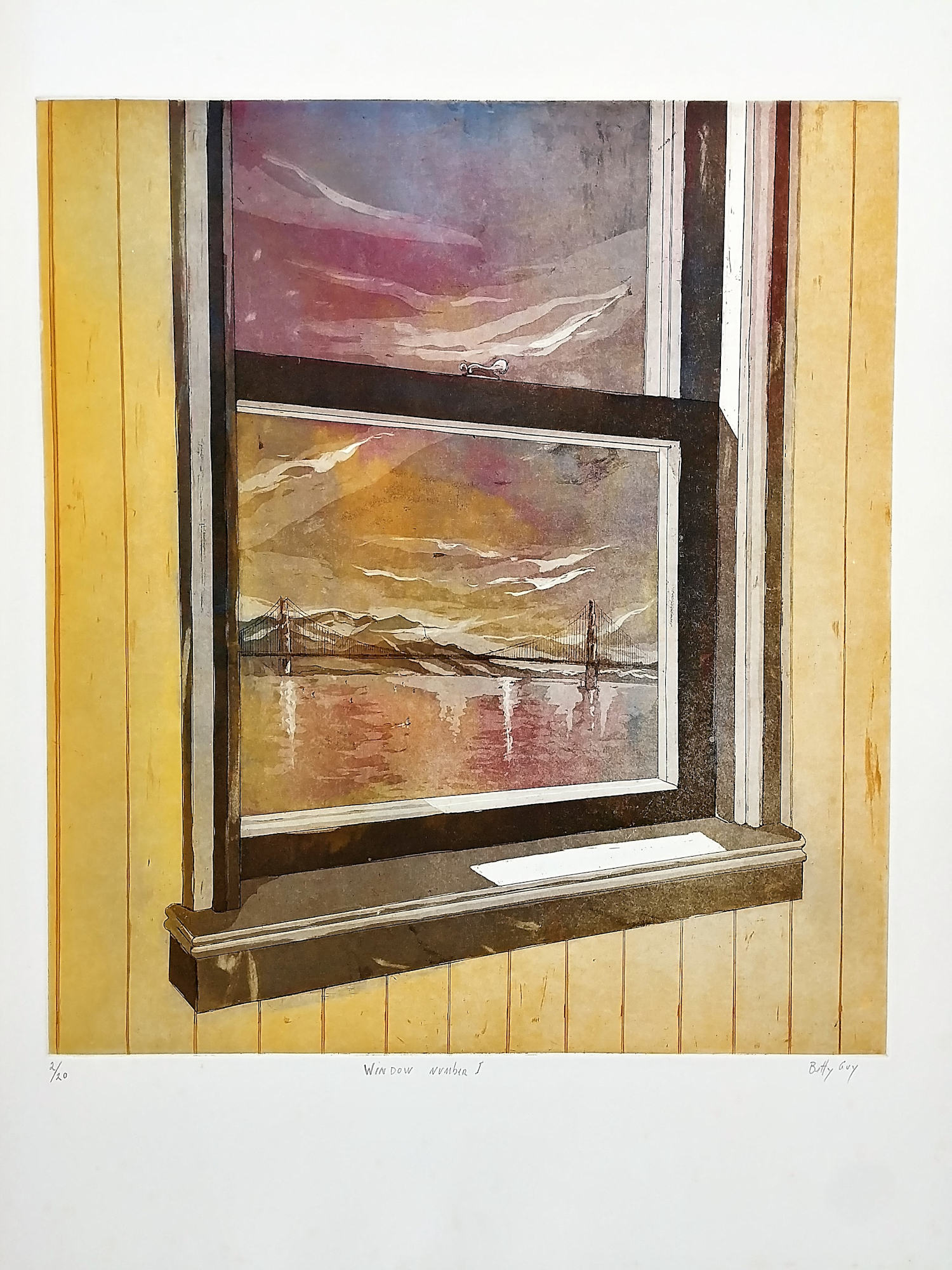 A view of the Golden Gate Bridge through a window. Oversized etching.