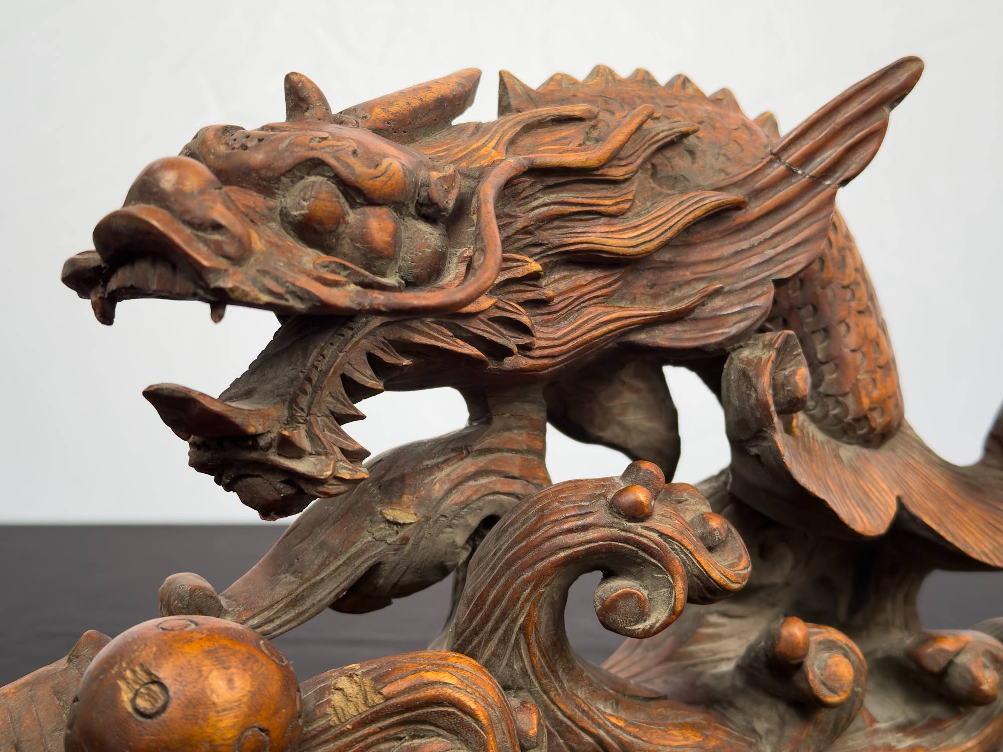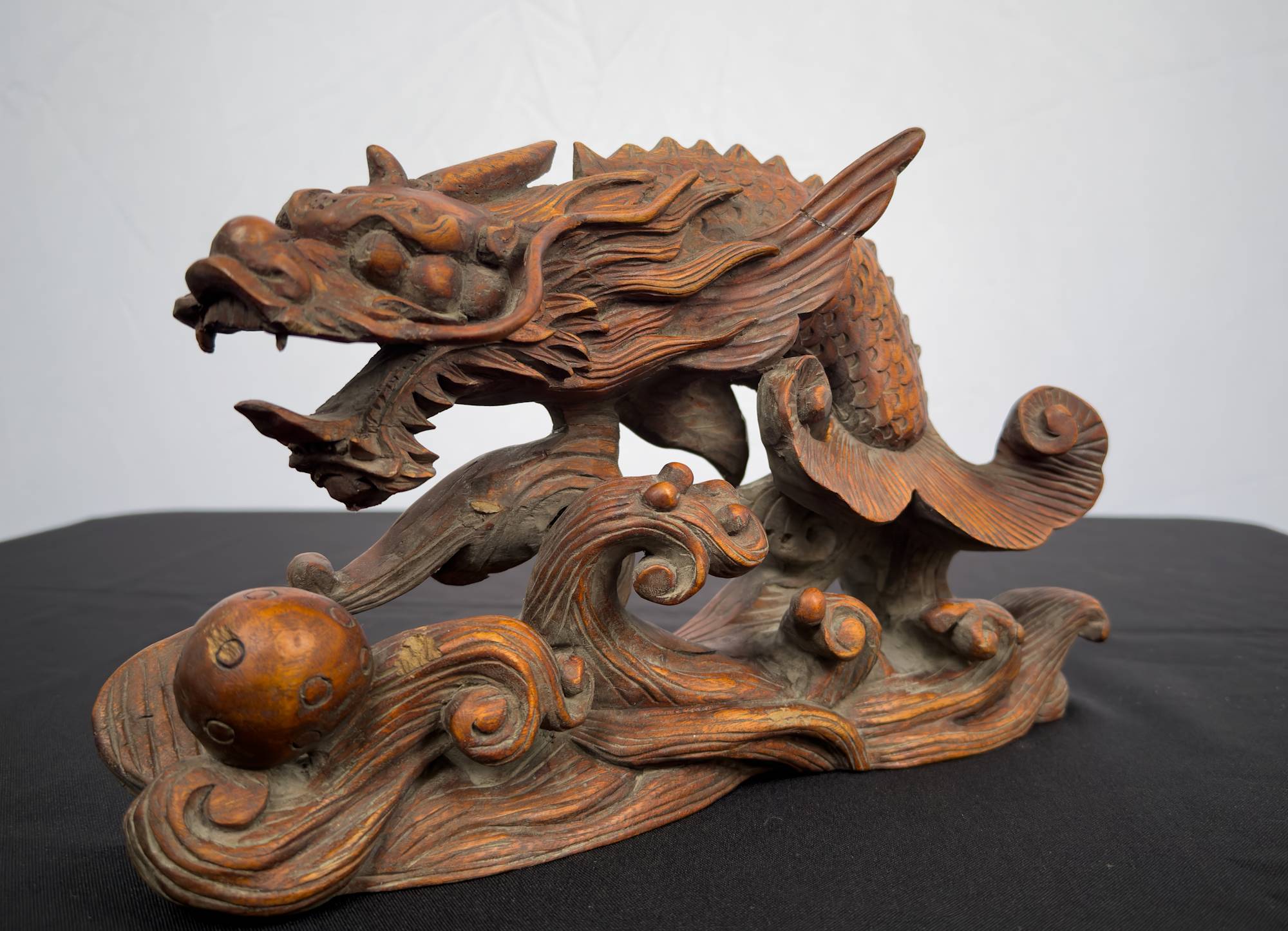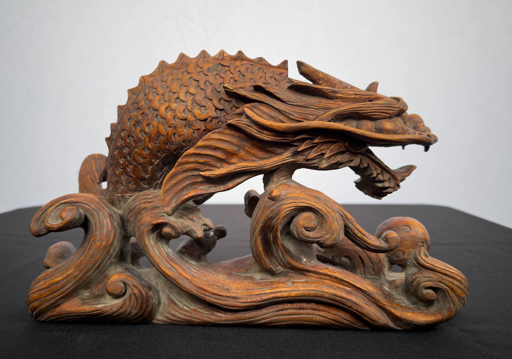 Sculpture of dragon on top of waves of water carved in wood