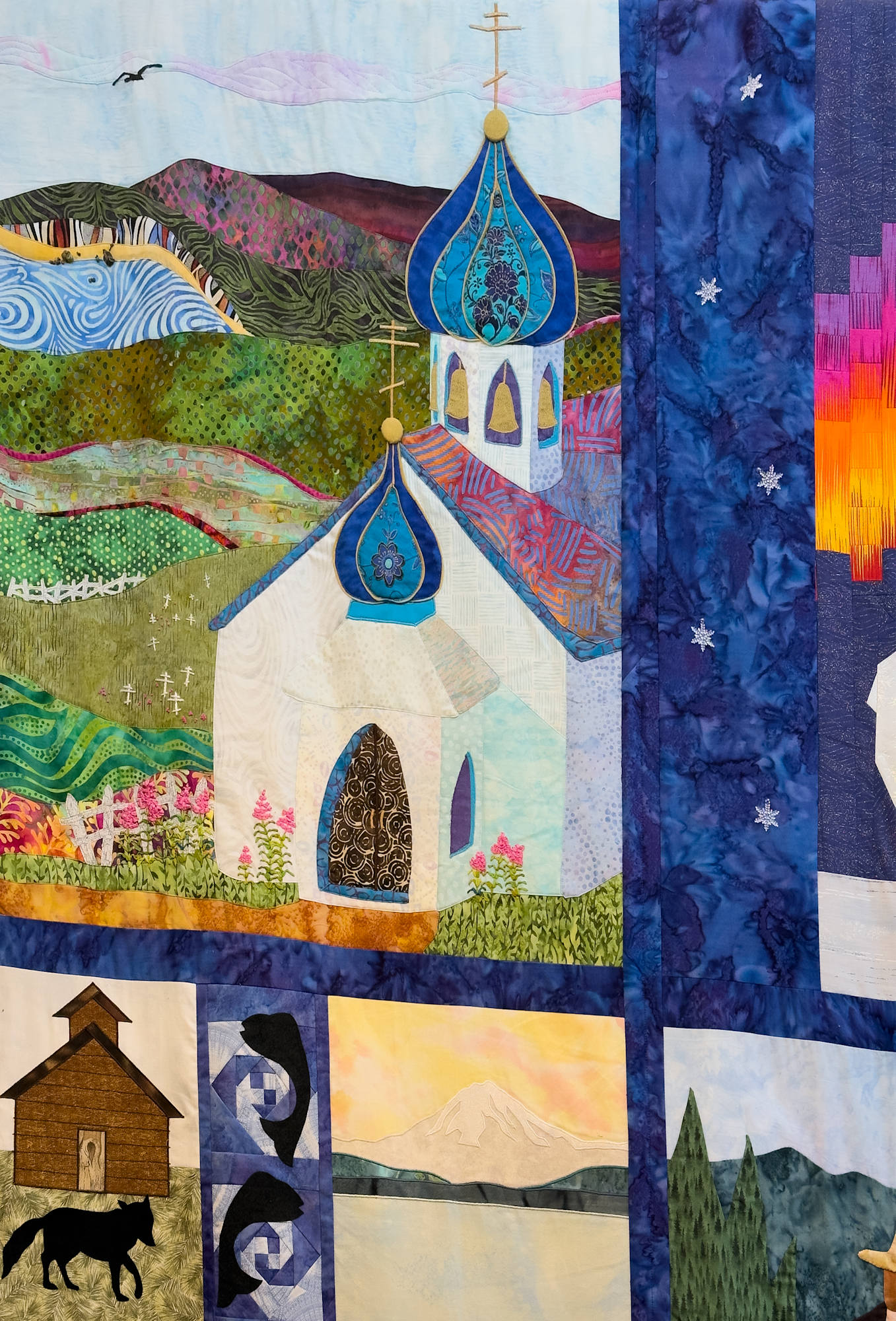 Alaska quilt. Panel 3 with bear and rainbow and Swanson School