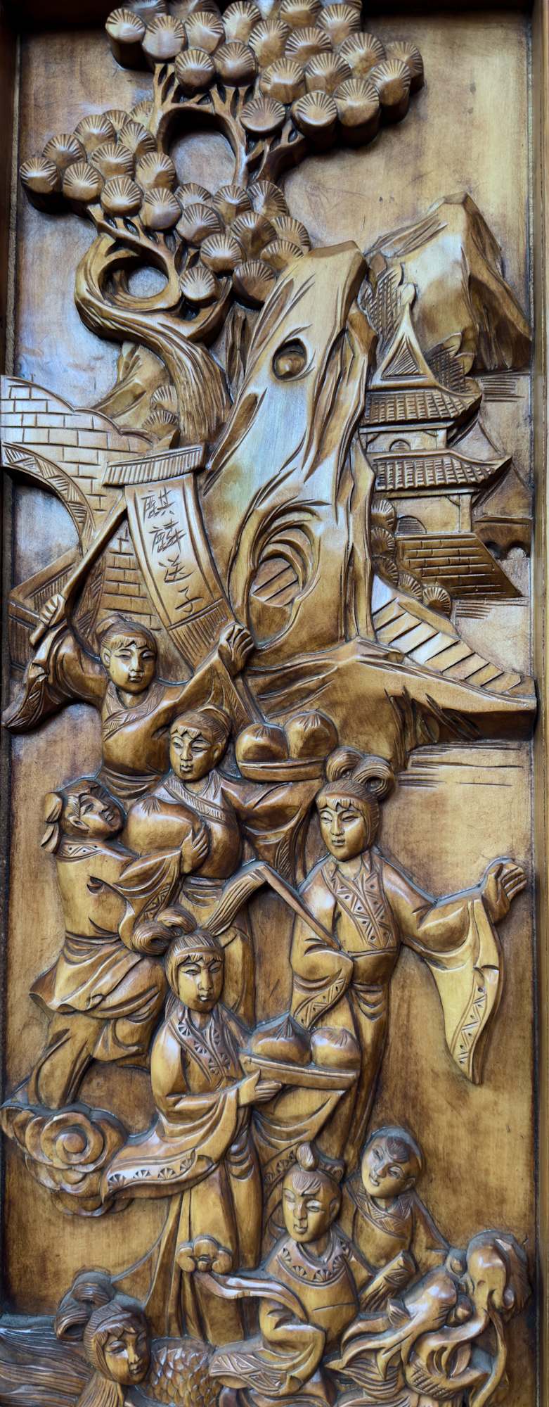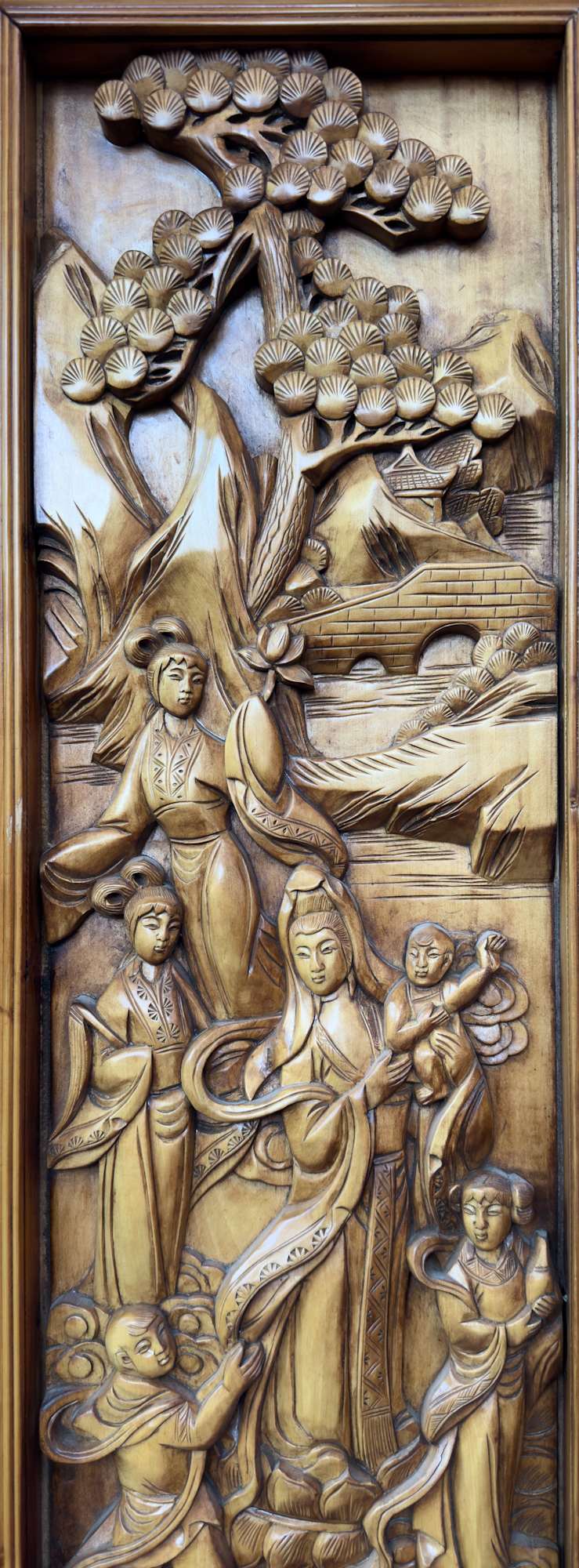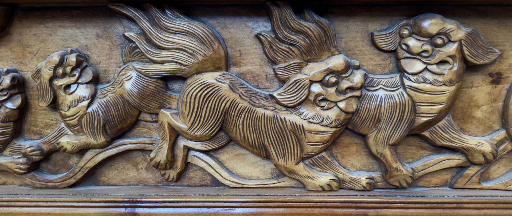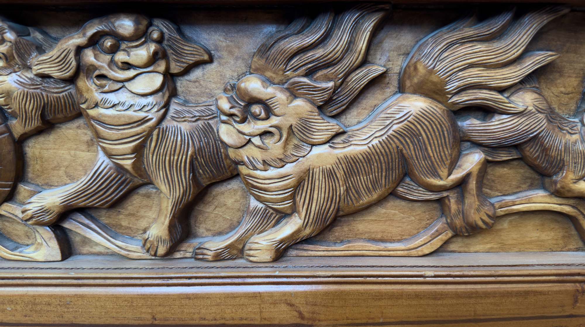 Light wood color, detailed wood carved cabinet, with doors and drawers
