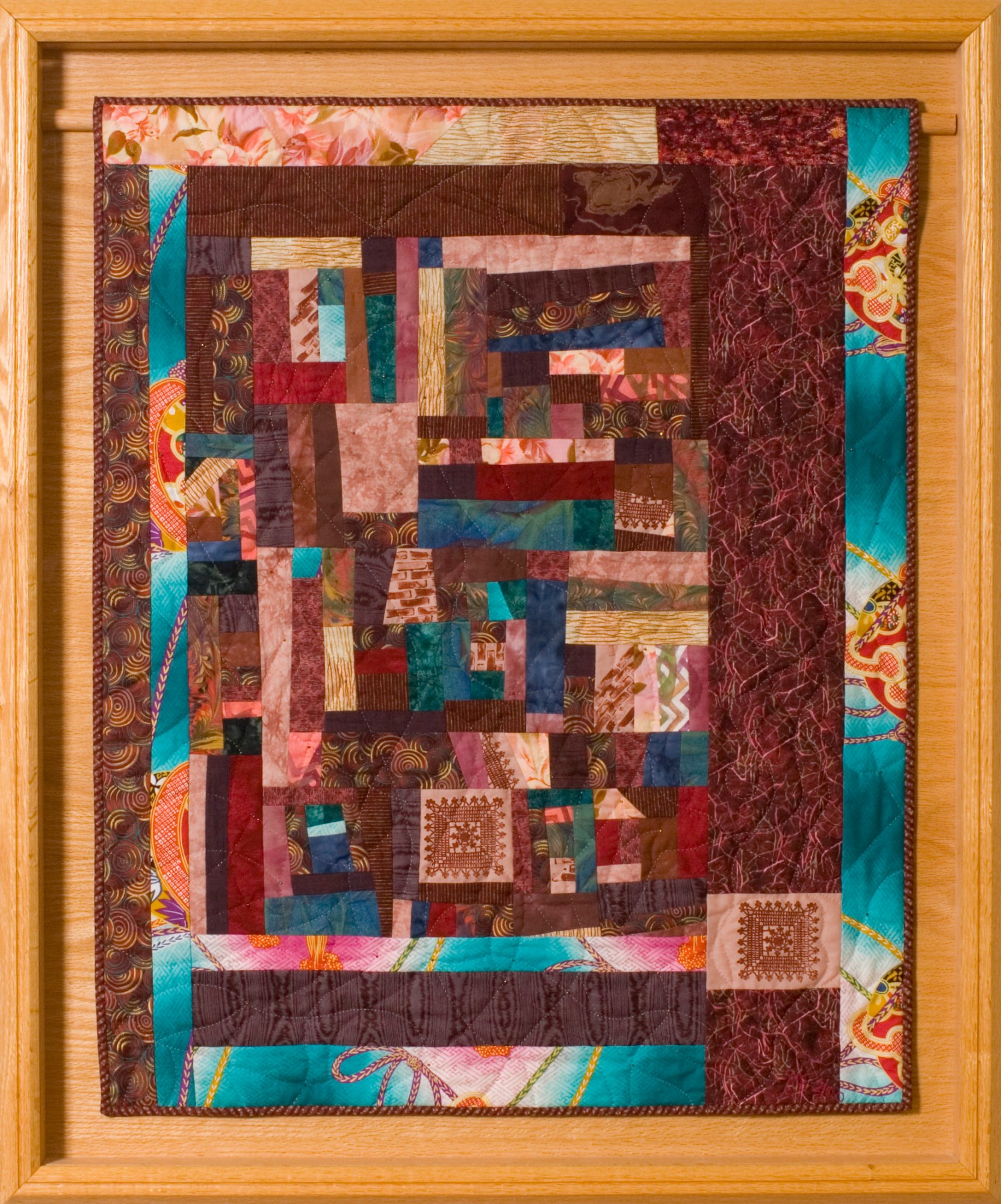 - Fiber art; commercial cotton, hand-stamped and thermographic transfer printed cottons; machine pieced, hand quilted, beaded