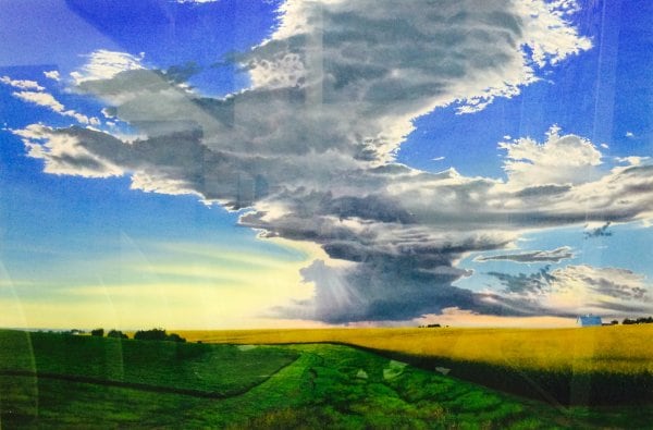 Large watercolor of the Midwestern evening sky after a storm, with green fields in the left foreground, corn at the right foreground, a barn at the right horizon, and a dramatic sky above.