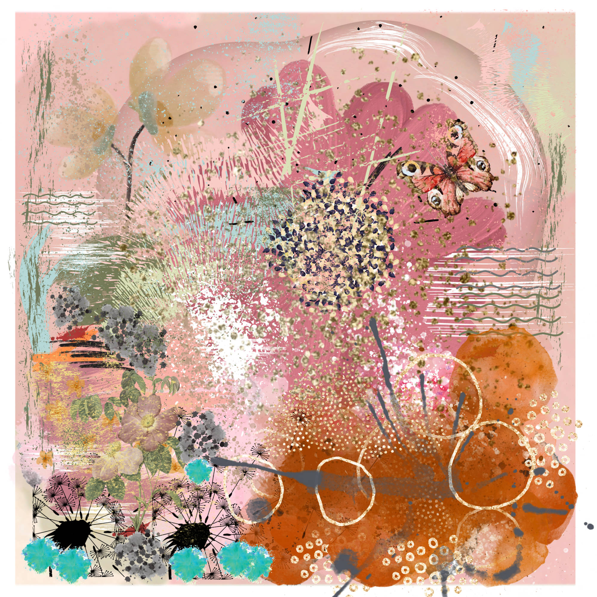 In this vibrant tapestry of life's rich spices, the artwork unfolds a dance of colors and textures. A delicate butterfly flutters amidst a garden of abstract florals, each petal whispering stories of growth and transformation. The pink hues blend seamlessly with earthy tones, creating a harmonious symphony that speaks to the heart. This piece embodies the artist's journey, where imagination meets vision, inviting you to explore the beauty of change and the joy of creation. A perfect addition to any space, it brings a touch of inspiration and warmth.