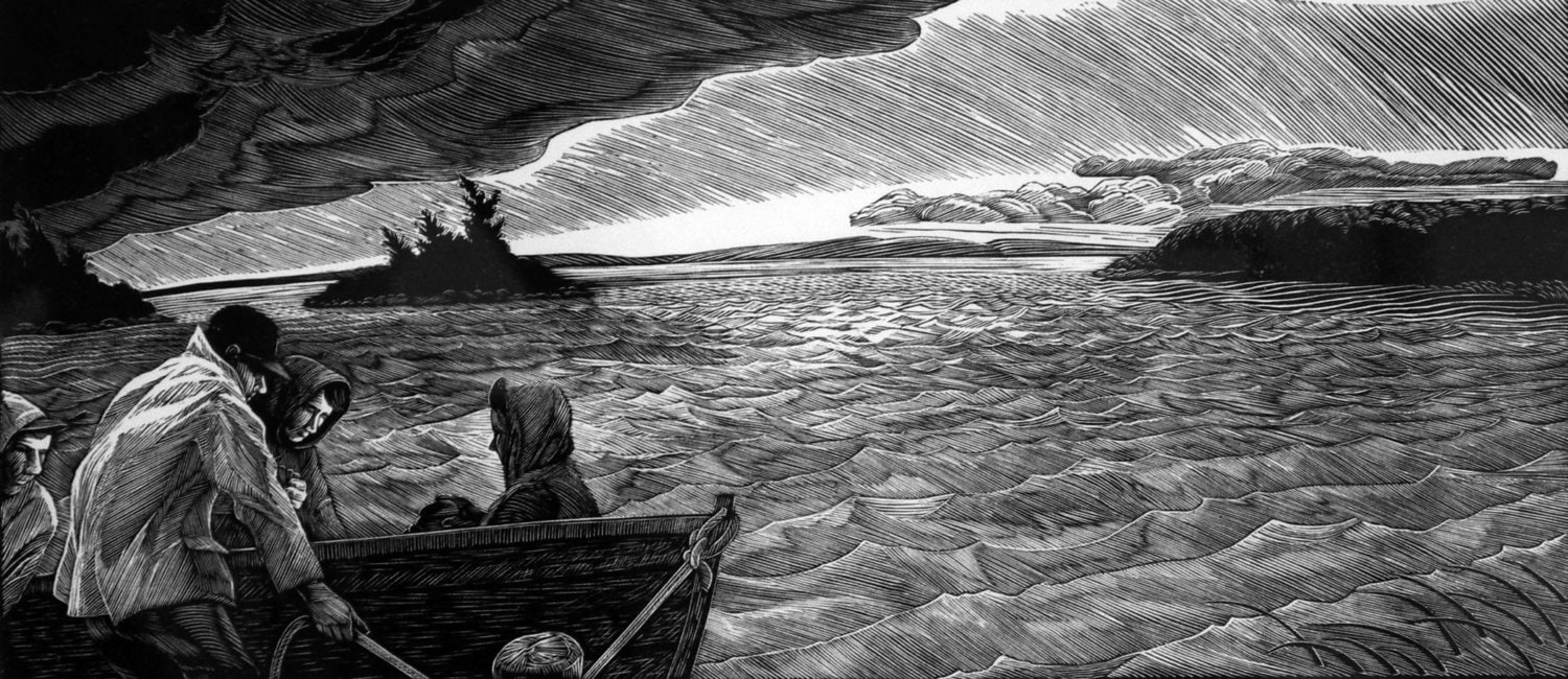 Item description: Figures in a rowing boat on a choppy sea with several land masses ahead.