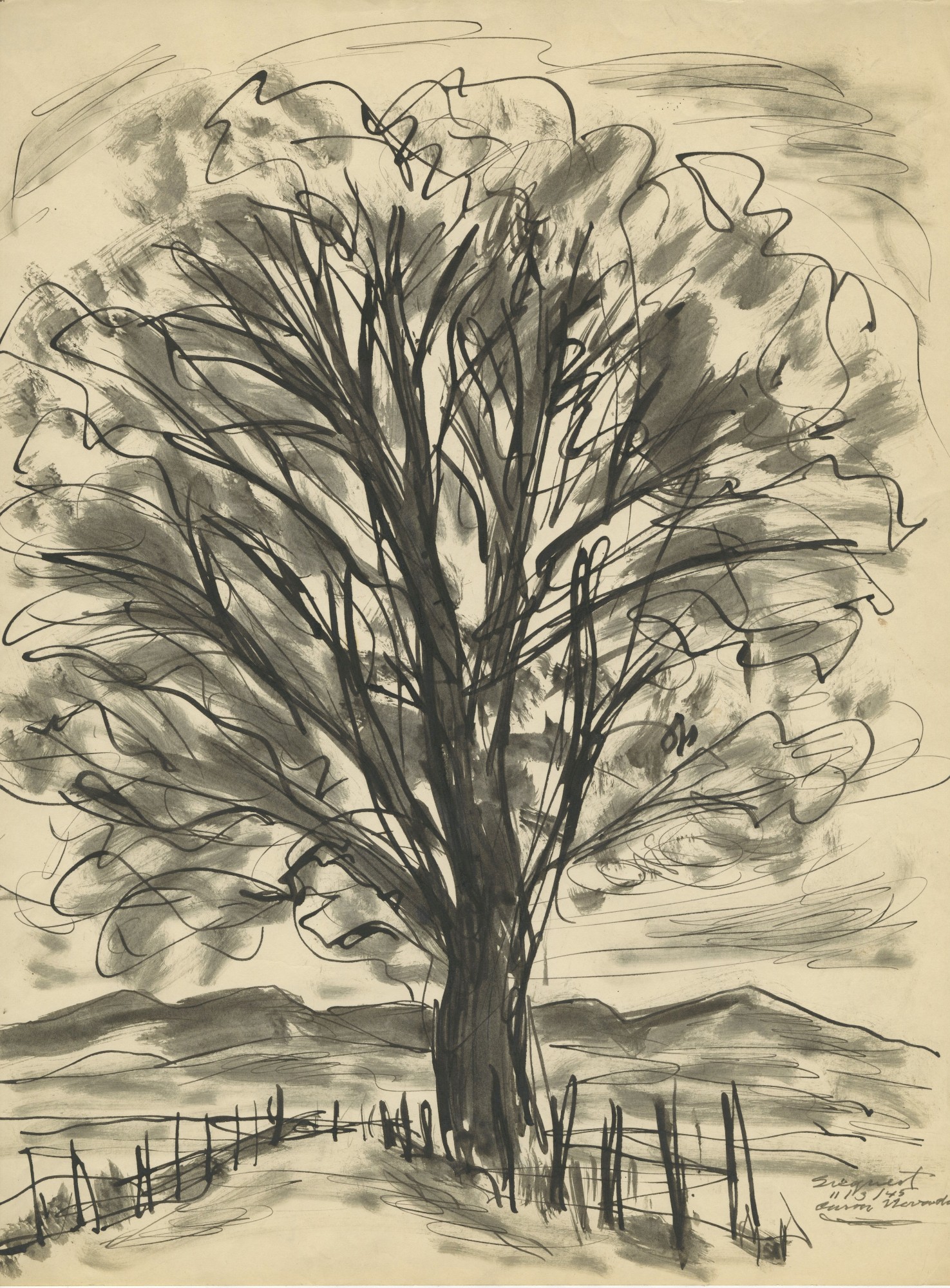 Item description: A tree to the right of a fenced road in Carson City, Nevada.
