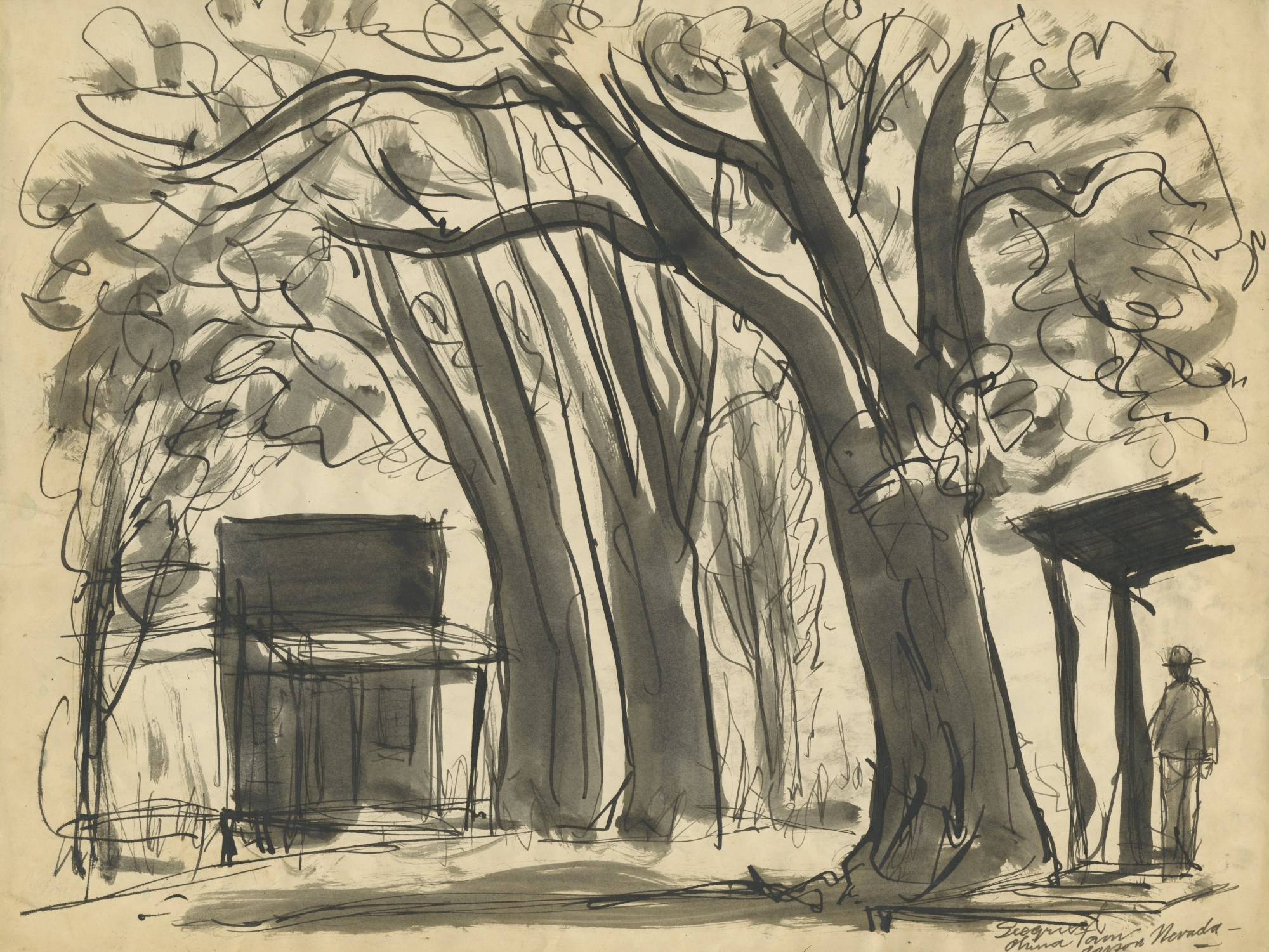 Item description: A tree with a man to the right and a structure to the left in Carson City, Nevada.