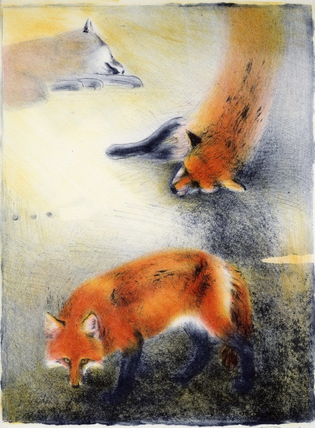 Item description: Two fallen foxes at top, fox at bottom staring directly at viewer, blue and yellow background.
