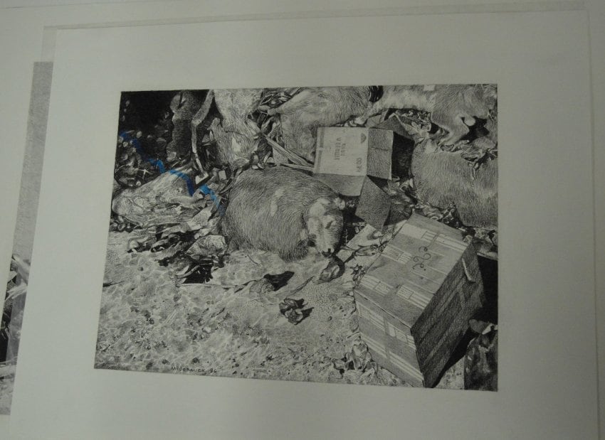 A piece depicting a sleeping sheep surrounded by other items that's mostly black and white, but has one small diagonal blue stripe in the left section.