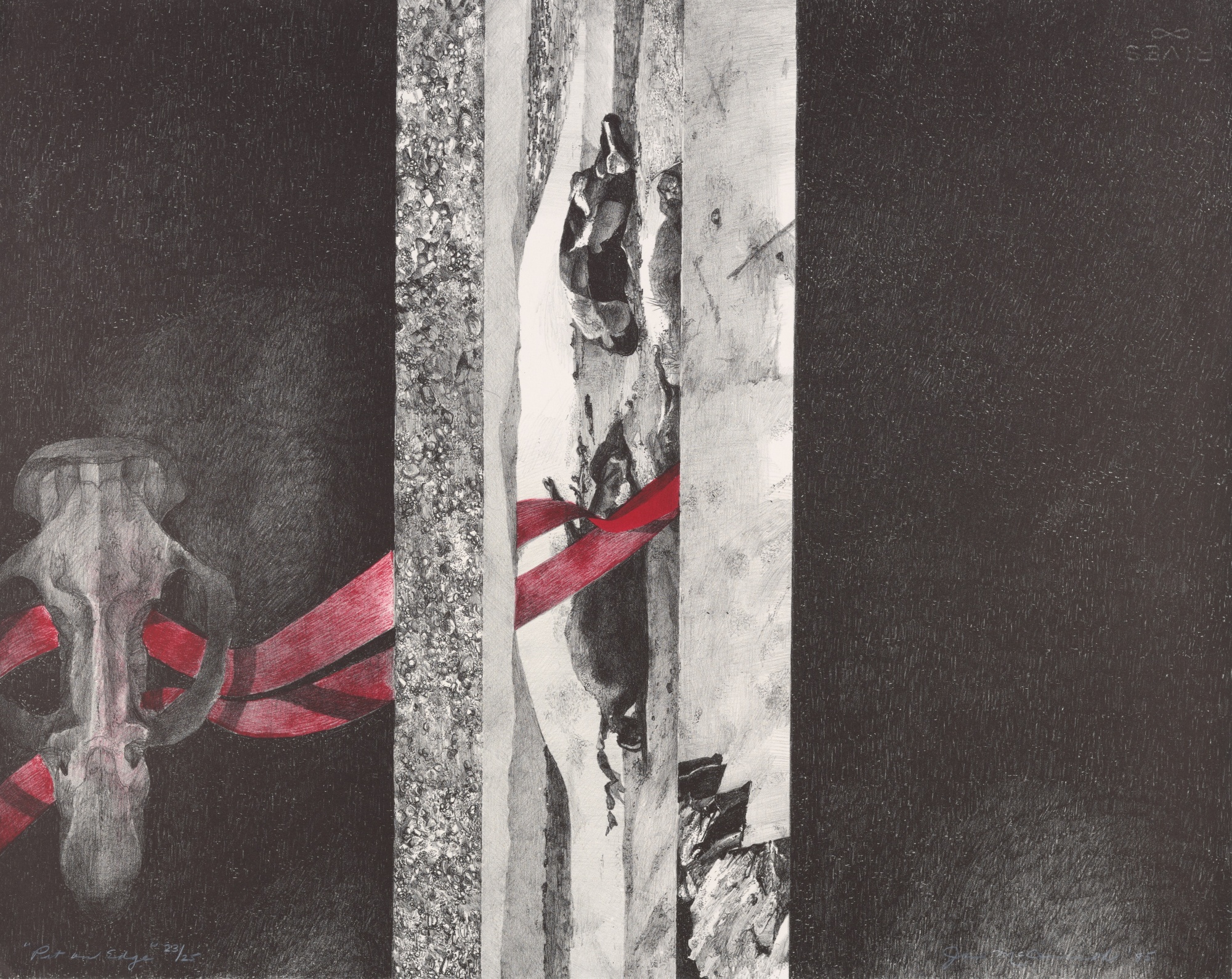 Animal skull on the left with ribbon behind it that goes into the pit at center. Scene in center is sideways and segmented.