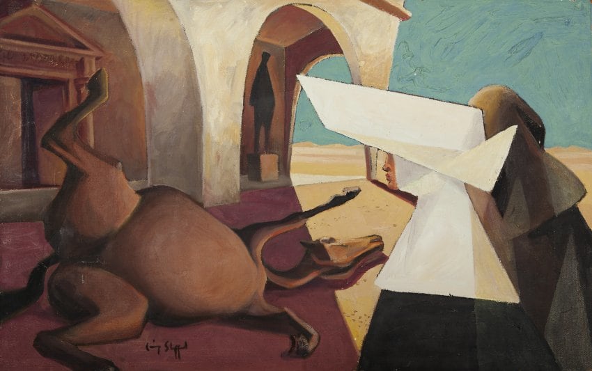 Item description: Dead horse outside of desert temple/museum watched by cubist nun.